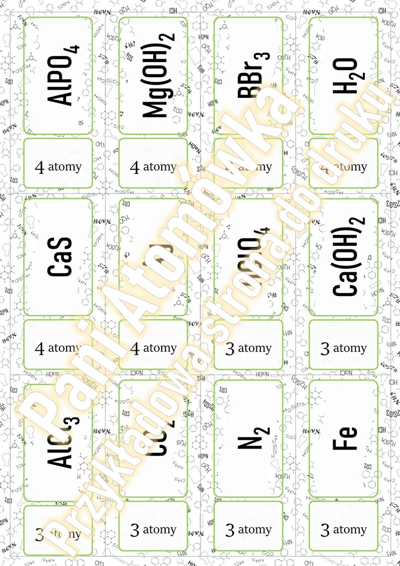💛 ZIELONE karty rozwijają wyłącznie umiejętność obliczania ilości atomów w cząsteczce opisanej wzorem chemicznym.