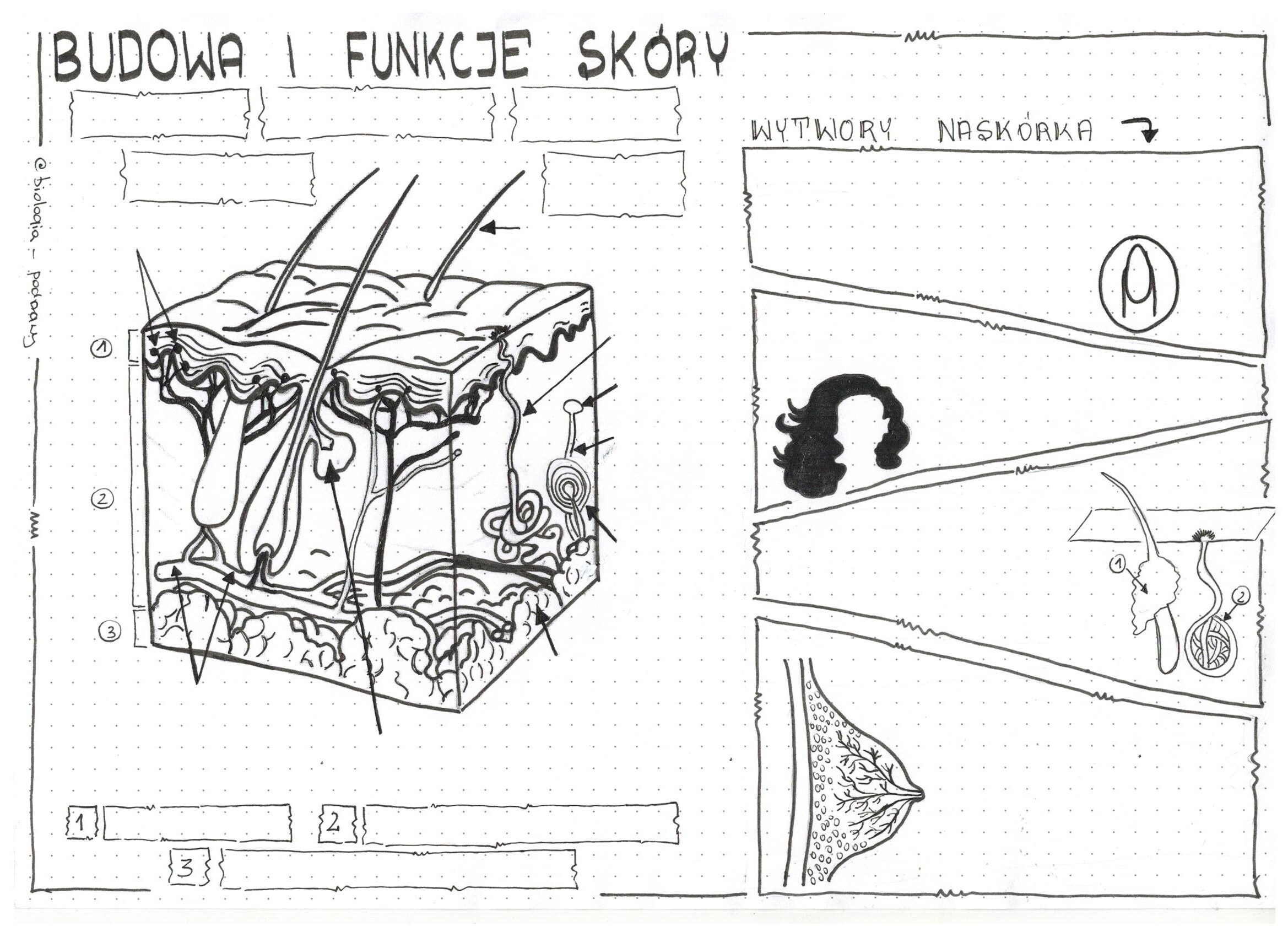 Sketchnotka "Skóra. Budowa i funkcje" jako gotowa notatka z lekcji w formie KP do uzupełnienia i pokolorowania