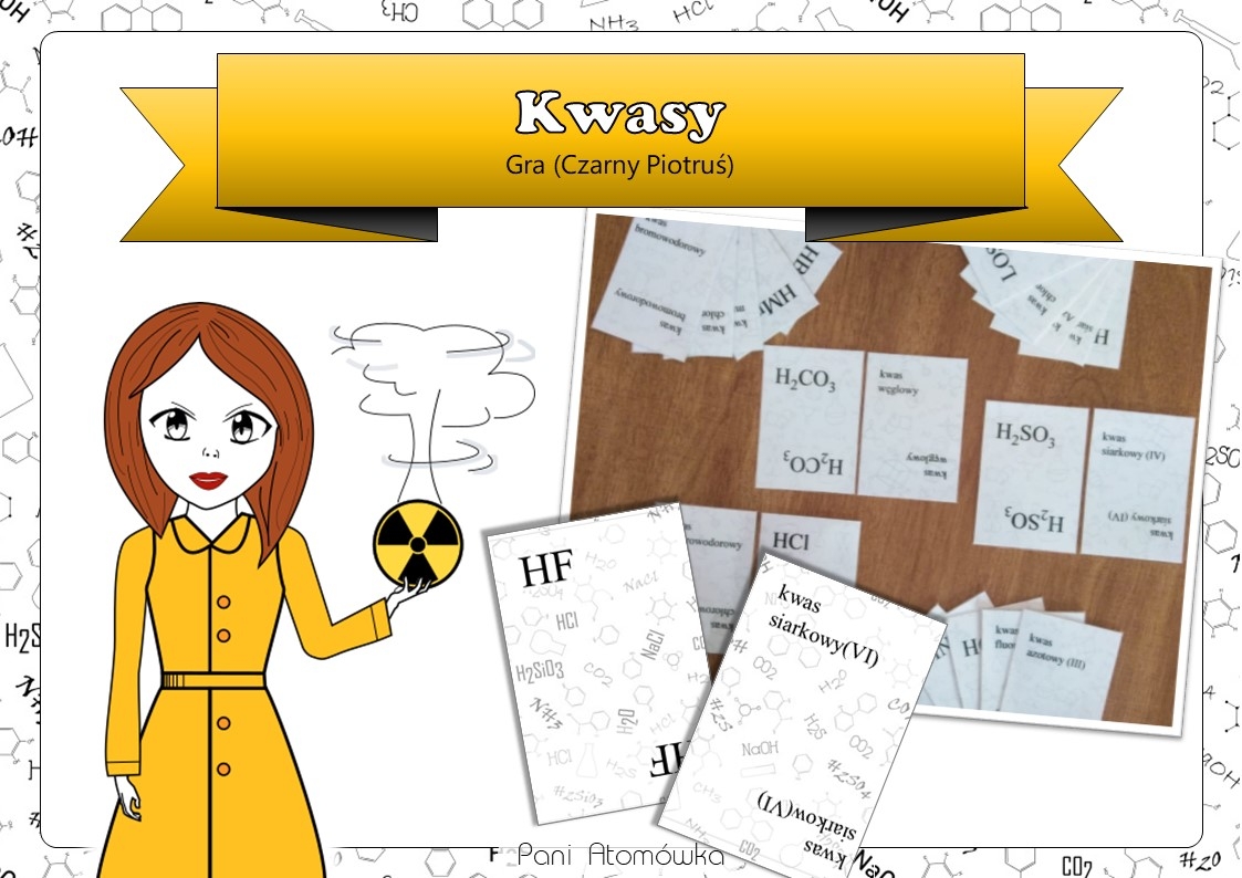 Gra edukacyjna angażująca wszystkich uczniów. Zasady oparte na kultowej karciance dla dzieci Czarny Piotruś. Gra idealnie nadaje się na lekcję utrwalającą wzory i nazewnictwo kwasów.