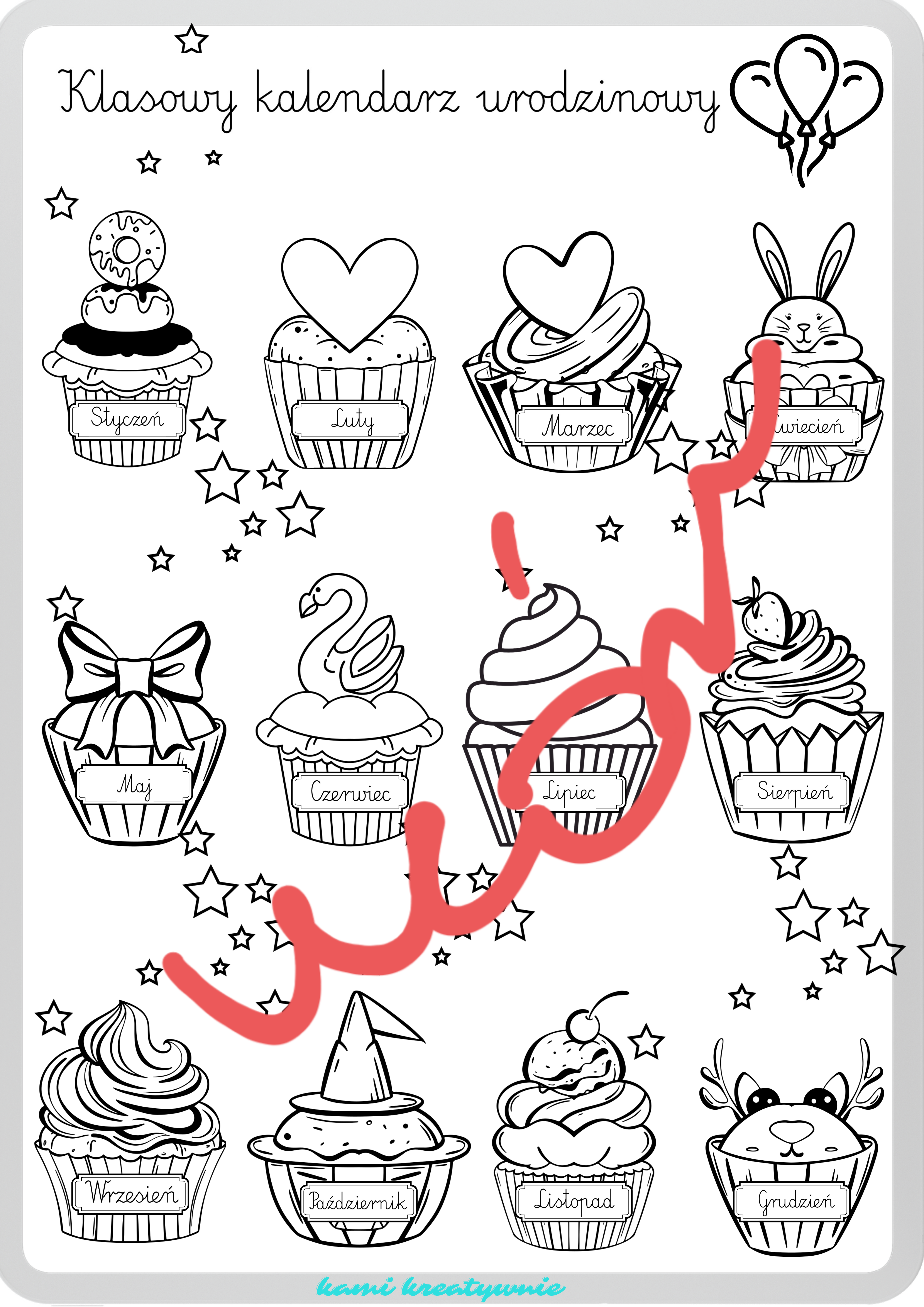 Kalendarz urodzin do wspólnego wykonania. Plakat składający się z 9 kartek. Dodatkowo świeczki do pokolorowania z miejscem na wpisanie imienia.