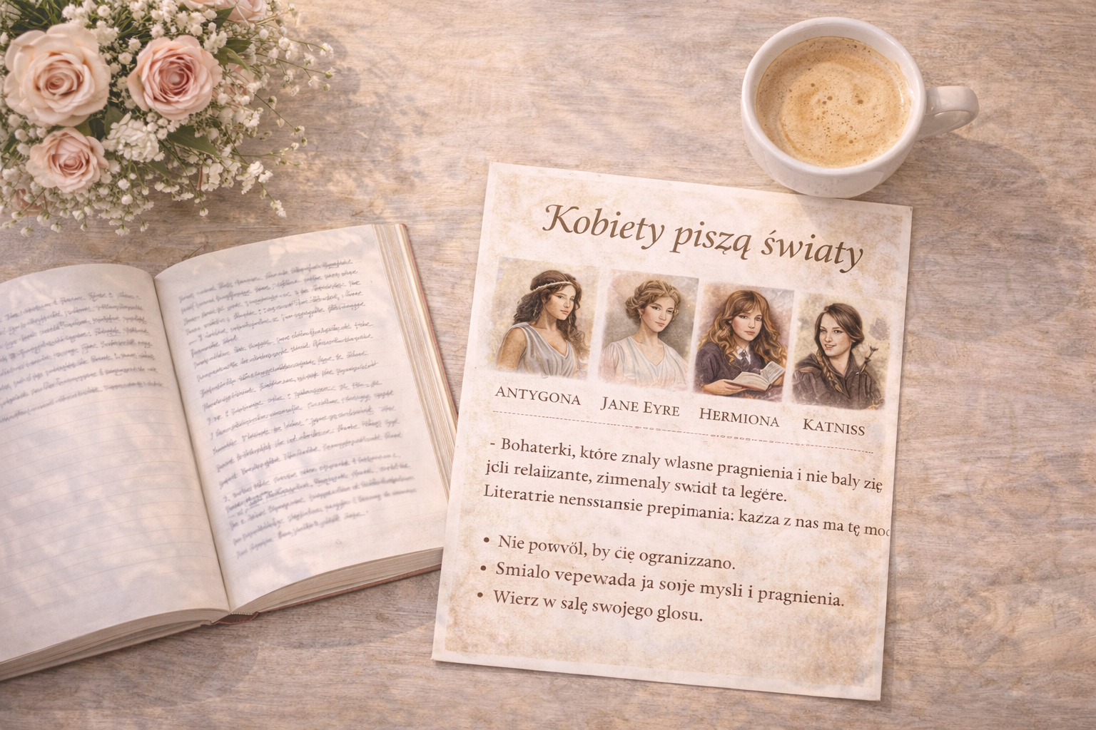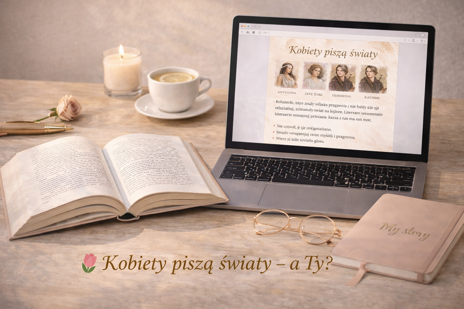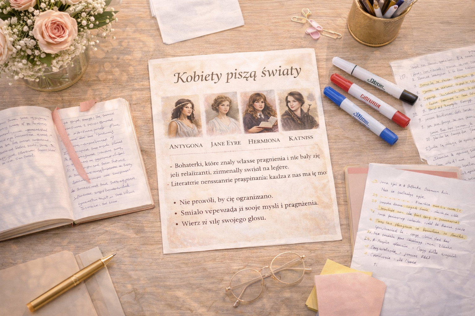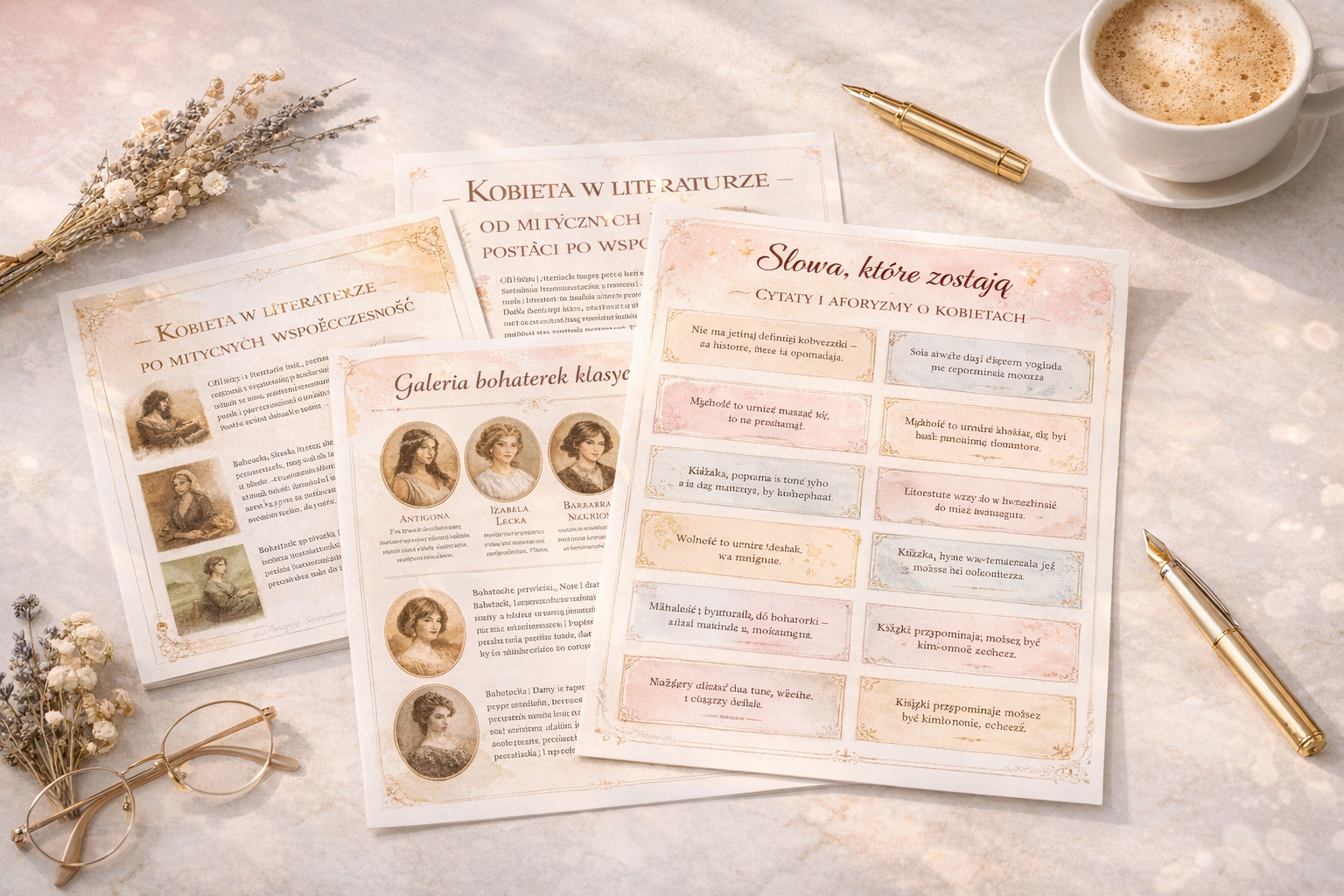 „Kobieta w literaturze – Portrety bohaterek” to cyfrowy zestaw stron, który zabiera uczniów w literacką podróż przez wieki — od Antygony po Katniss Everdeen, od Izabeli Łęckiej po Hermionę Granger.