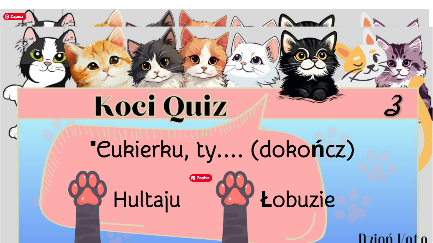 Quiz o kotach znanych z książek i bajek dla dzieci. Przygotowany w aplikacji Genial.ly i Canvie..