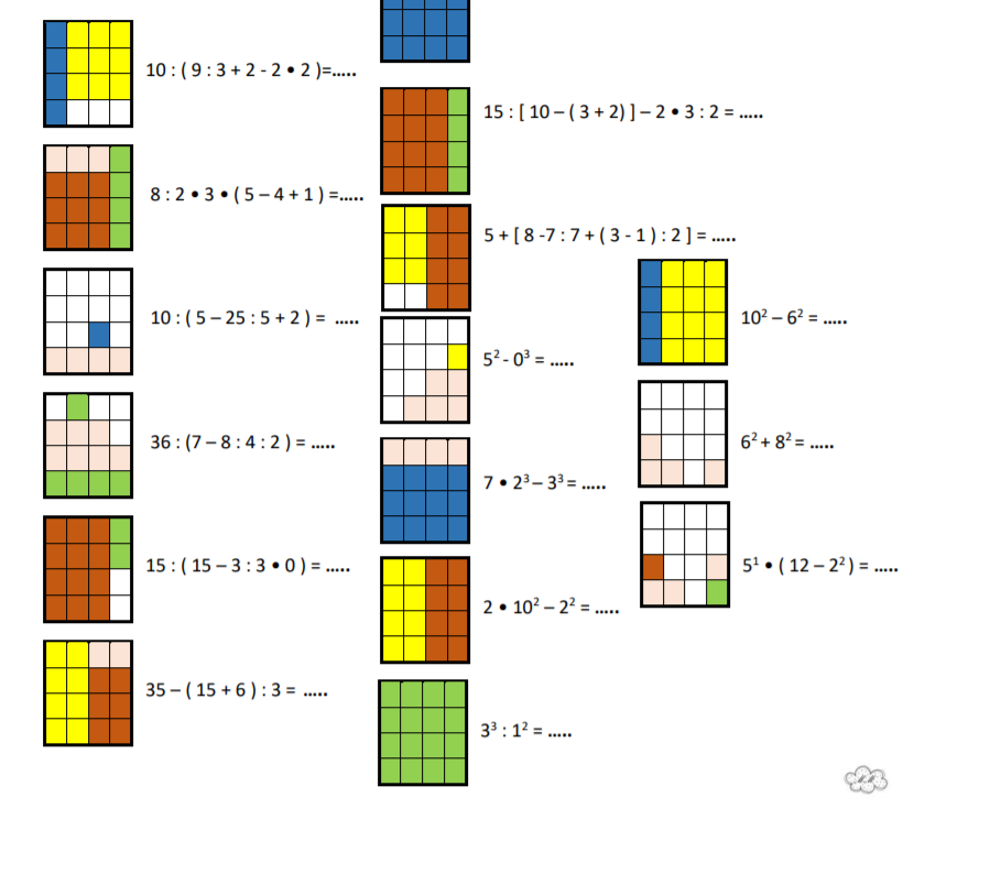 Zadaniem uczniów jest prawidłowe wykonanie wszystkich zadań. Otrzymany wynik należy odnaleźć w przygotowanej przeze mnie kratownicy, a następnie pomalować to pole według schematu znajdującego się przy działaniu. Poprawne wykonanie całego zadania odkryje tajemniczy rysunek :)