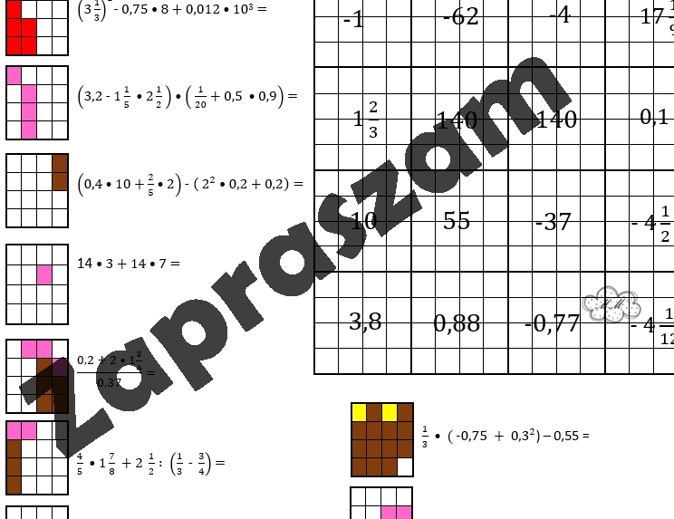 Zadaniem uczniów jest prawidłowe wykonanie wszystkich zadań. Otrzymany wynik należy odnaleźć w przygotowanej przeze mnie kratownicy, a następnie pomalować to pole według schematu znajdującego się przy działaniu. Poprawne wykonanie całego zadania odkryje tajemniczy rysunek ? Zestaw zawiera kartę pracy + rozwiązanie ?