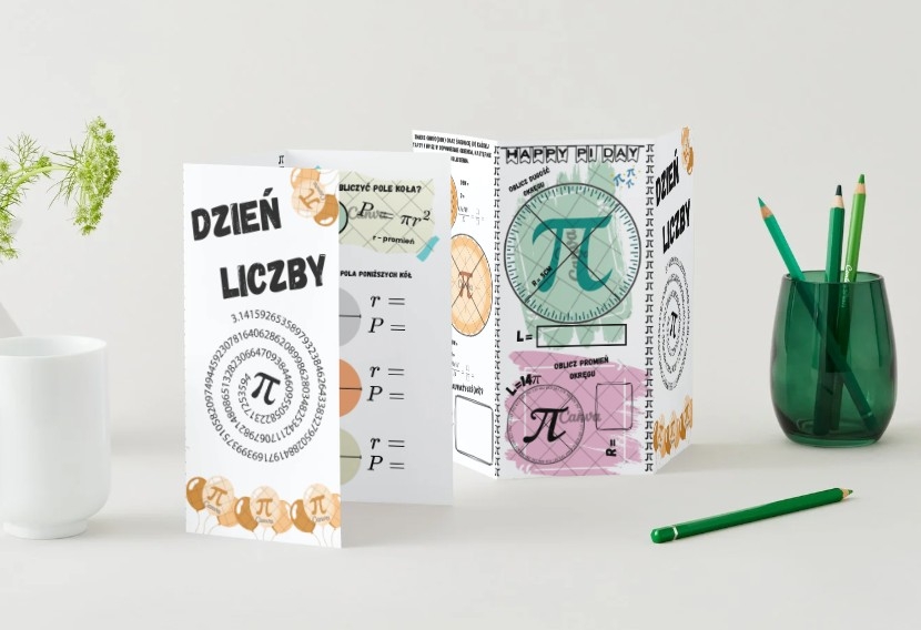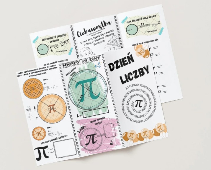 Składana broszura z różnymi zadaniami z kół i okręgów, wersja zawiera opis jak obliczać pole koła i długość okręgu. Broszury należy drukować obustronnie z odbiciem względem krótkiego boku kartki.