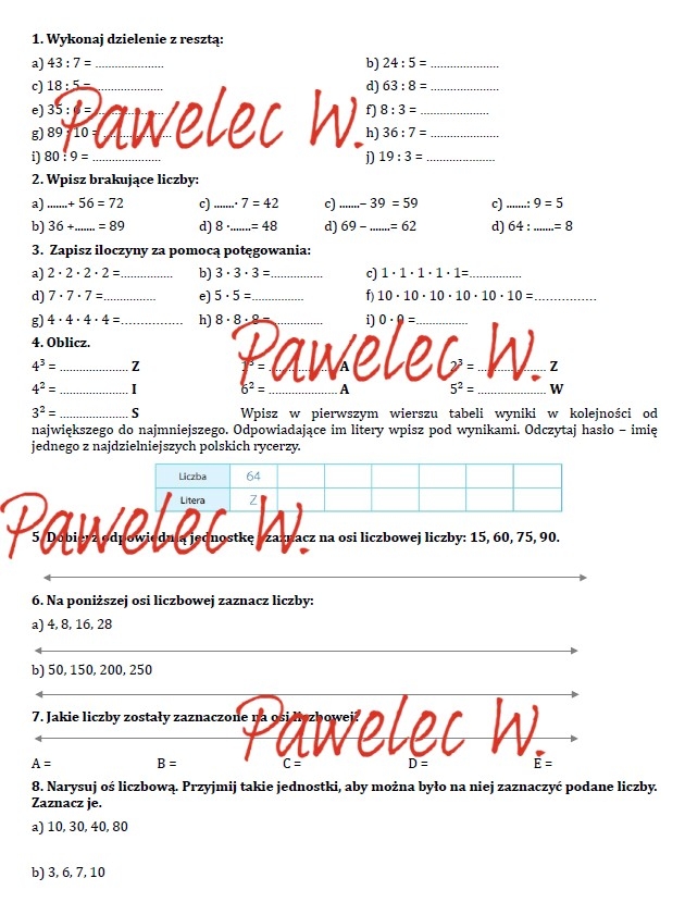 Karta pracy idealna do sprawdzenia wiadomości z zakresu: dzielenia z resztą, potęgowania, kolejności wykonywania działań i dzielenia z resztą.