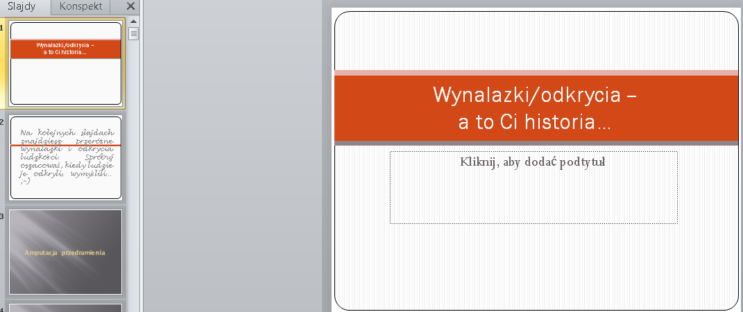 W materiale umieszczono prezentację z kreatywnym zadaniem dotyczącym wynalazków - na slajdach parzystych umieszczono nazwę wynalazku/odkrycia, a na nieparzystych - datę wynalazienia/odkrycia. Zadanie uczniów polega na odgadnięciu daty wynalazienia/odkrycia wynalazku.