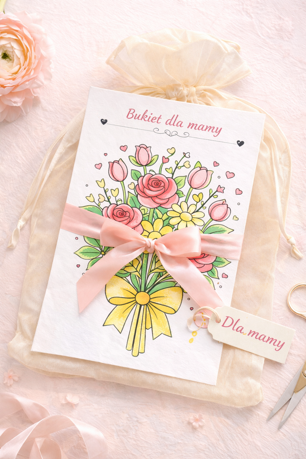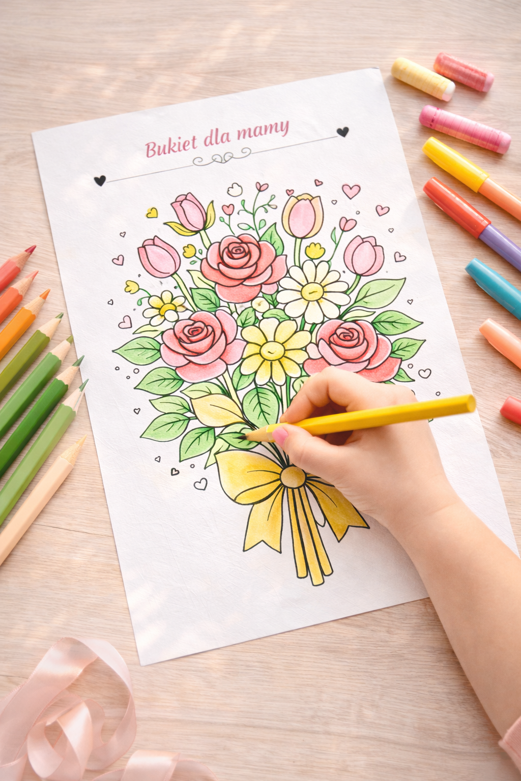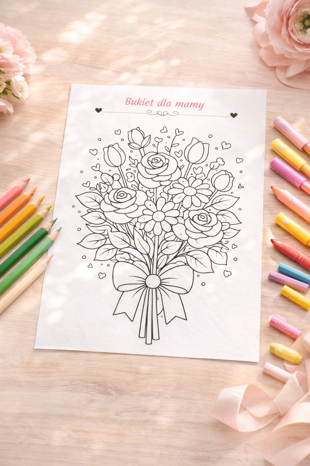 Kolorowanka „Bukiet dla mamy” to piękny zestaw ilustracji kwiatowych, które dziecko może pokolorować i wręczyć jako osobisty, pełen miłości upominek 💐