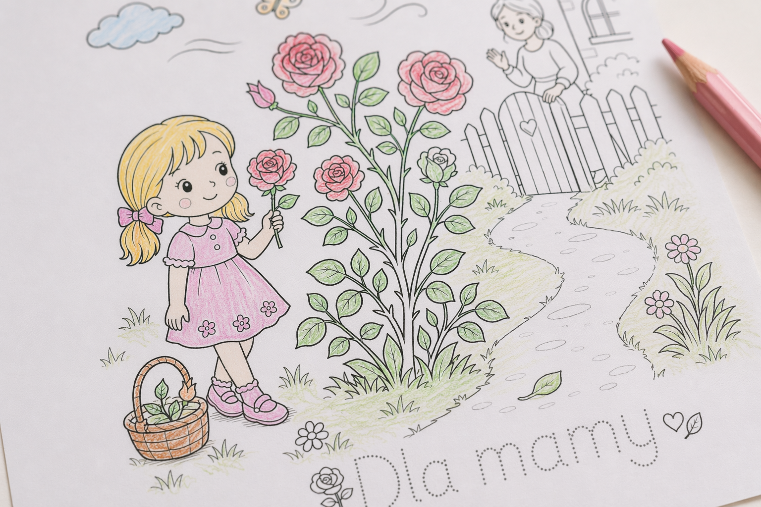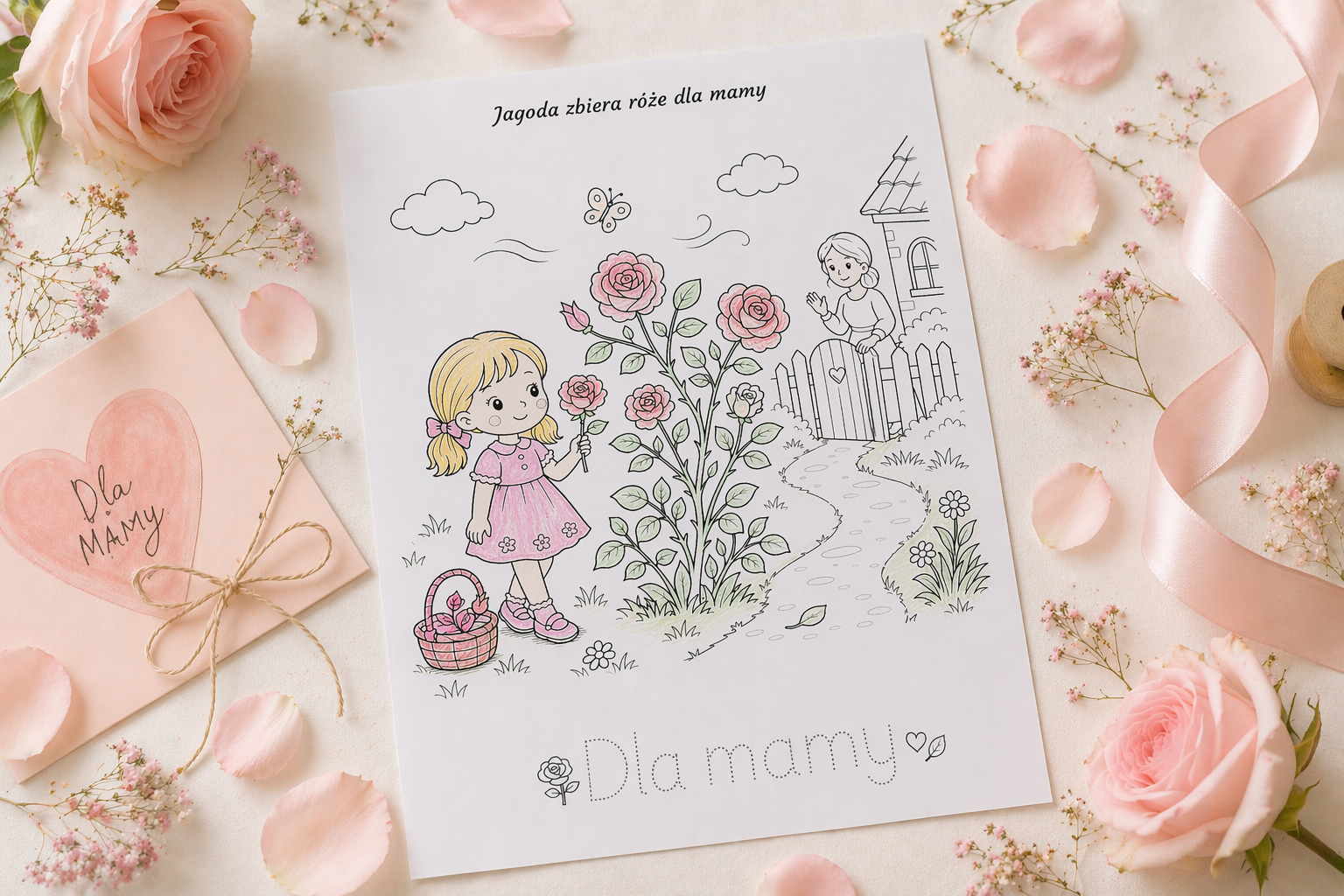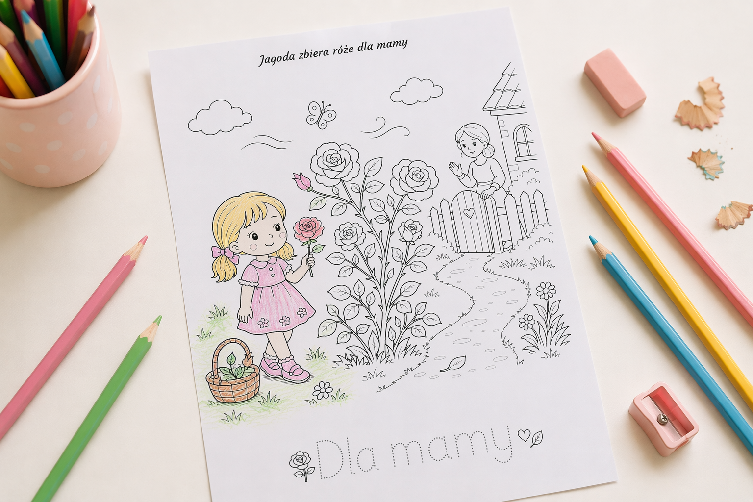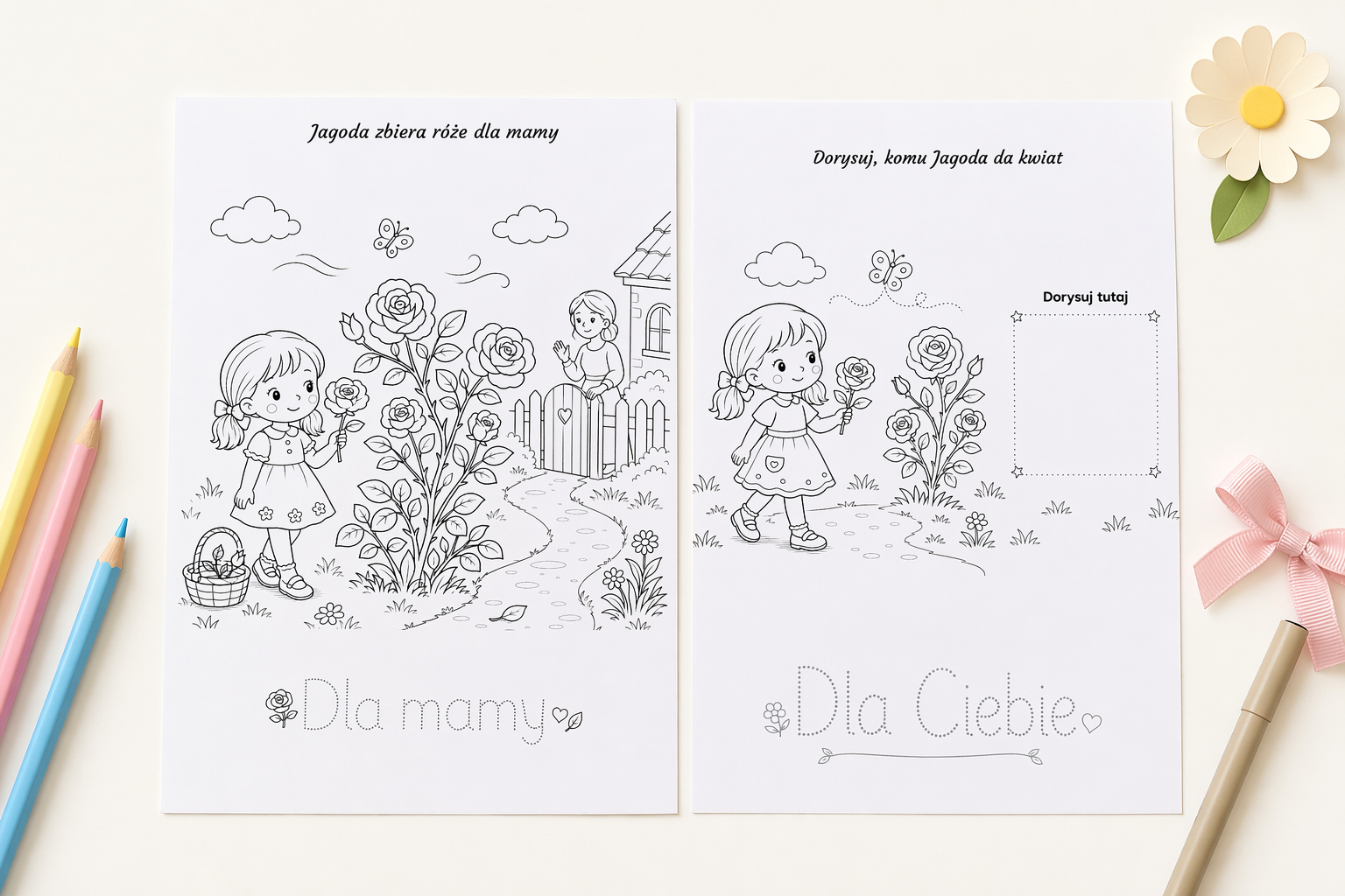 Przygotowałam uroczą, dwustronicową kolorowankę z kartą pracy „Jagoda zbiera róże dla mamy” 🌹💕 To materiał, który łączy spokojną, ciepłą ilustrację z prostą aktywnością dla dziecka. Na pierwszej stronie pokazuję Jagodę, która zbiera róże dla mamy, a całość uzupełnia napis po śladzie „Dla mamy”. Na drugiej stronie dodałam element twórczy – dziecko może dorysować, komu Jagoda da kwiat, a potem poćwiczyć pisanie po śladzie przy napisie „Dla Ciebie”.