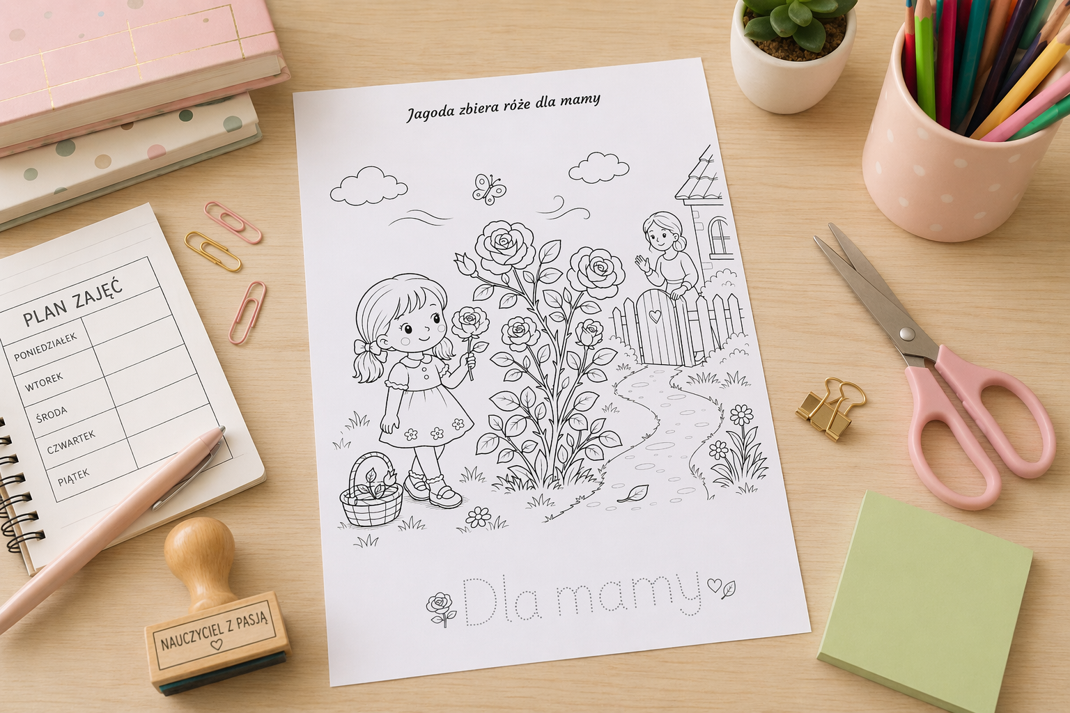 Tworząc ten materiał, zależało mi na tym, żeby był nie tylko ładny, ale też naprawdę przyjemny w użyciu 😊 Zrobiłam go w lekkim, dziecięcym stylu, z dużą ilością miejsca, czytelną kompozycją i sympatycznymi ilustracjami, które zachęcają do kolorowania. To propozycja idealna na Dzień Mamy, zajęcia w przedszkolu, edukację wczesnoszkolną, pracę w domu albo jako miły, kreatywny dodatek do tematyki o rodzinie i uczuciach 🌷✨