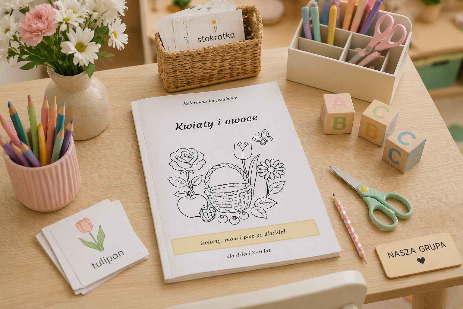 Można ją wykorzystać na wiele sposobów – do kolorowania, rozmów, nauki słownictwa czy pierwszych prób pisania. Ja sama używam takich materiałów w pracy i wiem, jak dobrze się sprawdzają ❤️