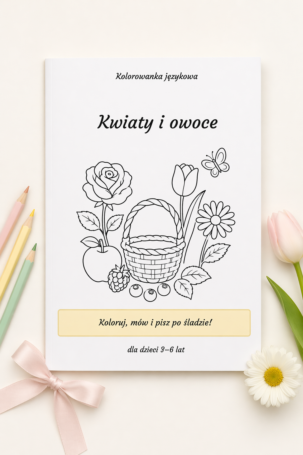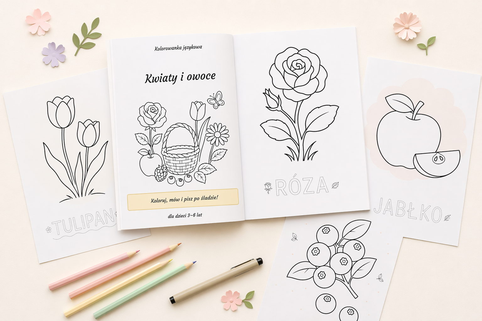 Bardzo zależało mi na tym, żeby ilustracje były czytelne, estetyczne i dopasowane do wieku 3–6 lat 👶 Dlatego są proste, bez zbędnych detali – idealne dla małych rączek. W kolorowance pojawiają się m.in. róża, tulipan, stokrotka, jabłko, malina czy jagoda, a także scenka z koszykiem pełnym owoców 🍓🧺