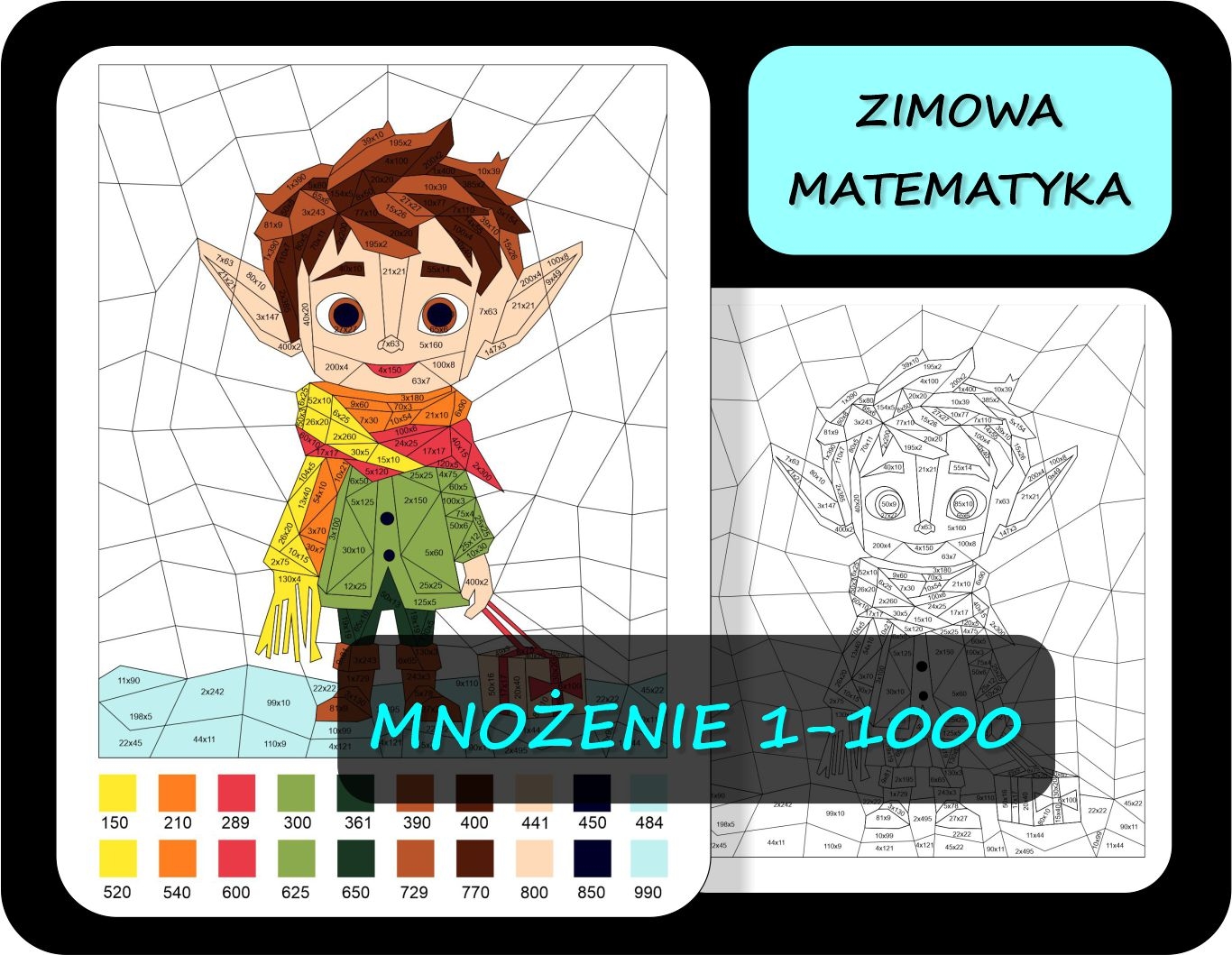 Kolorowanie według wyników mnożenia 1-1000 – ELF! Ta karta pracy łączy matematyczną gimnastykę umysłu z kreatywną zabawą! Uczniowie rozwiązują działania z zakresu mnożenia 1-1000 (mnożenie liczb jednocyfrowych, dwucyfrowych i trzycyfrowych), a następnie kolorują odpowiednie pola zgodnie z legendą. Po poprawnym uzupełnieniu pojawi się postać Elfa, co dodatkowo motywuje dzieci do pracy i wzbudza ciekawość. Co rozwija ta karta pracy? utrwalanie tabliczki mnożenia, koncentrację i uważność, koordynację wzrokowo–ruchową, satysfakcję z odkrywania ukrytego obrazka. Dla kogo? Idealna dla klas 3-5, na świetlicę, edukacji domowej lub jako atrakcyjna praca domowa.