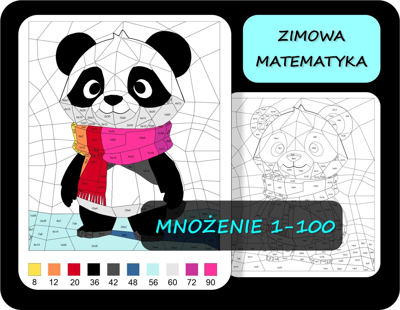 Kolorowanie według wyników mnożenia 1-100 – Zimowa Panda Ta karta pracy łączy matematyczną gimnastykę umysłu z kreatywną zabawą! Uczniowie rozwiązują proste działania z zakresu mnożenia 1-100, a następnie kolorują odpowiednie pola zgodnie z legendą. Po poprawnym uzupełnieniu pojawi się panda zimowa, co dodatkowo motywuje dzieci do pracy i wzbudza ciekawość. Co rozwija ta karta pracy? utrwalanie tabliczki mnożenia, koncentrację i uważność, koordynację wzrokowo–ruchową, satysfakcję z odkrywania ukrytego obrazka. Dla kogo? Idealna dla klas 2-5, zajęć wyrównawczych, edukacji domowej lub jako atrakcyjna praca domowa.