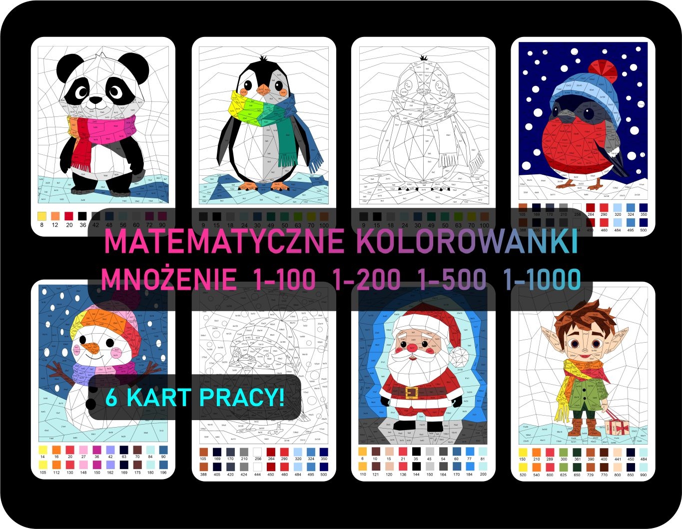 ✨ NOWE KOLOROWANKI ZIMOWE MATEMATYCZNE z mnożeniem w zakresie 1–100, 1-200, 1-500 ORAZ 1-1000! – Poziom trudny ✨ 6 kart pracy! ━━━━━━━━━━━━━━━━━━━━━━━━━━ Przedstawiamy zestaw kart pracy, który wprowadza dzieci w świat tabliczki mnożenia w przyjemny, kolorowy i angażujący sposób. To idealna pomoc do nauki w klasie i w domu — dziecko koloruje obrazek według wyników mnożenia, dzięki czemu nauka staje się zabawą i tworzy małe matematyczne dzieła sztuki. ━━━━━━━━━━━━━━━━━━━━━━━━━━ 🎨 CO ZNAJDZIESZ W ZESTAWIE? ━━━━━━━━━━━━━━━━━━━━━━━━━━ ✔2 karty pracy – mnożenie w zakresie 1-100 ✔2 karty pracy – mnożenie w zakresie 1-200 ✔1 kart1 pracy – mnożenie w zakresie 1-500 ✔1 karta pracy – mnożenie w zakresie 1-1000 ✔ 6 kart z rozwiązaniami ✔ Format A4, gotowy do wydruku