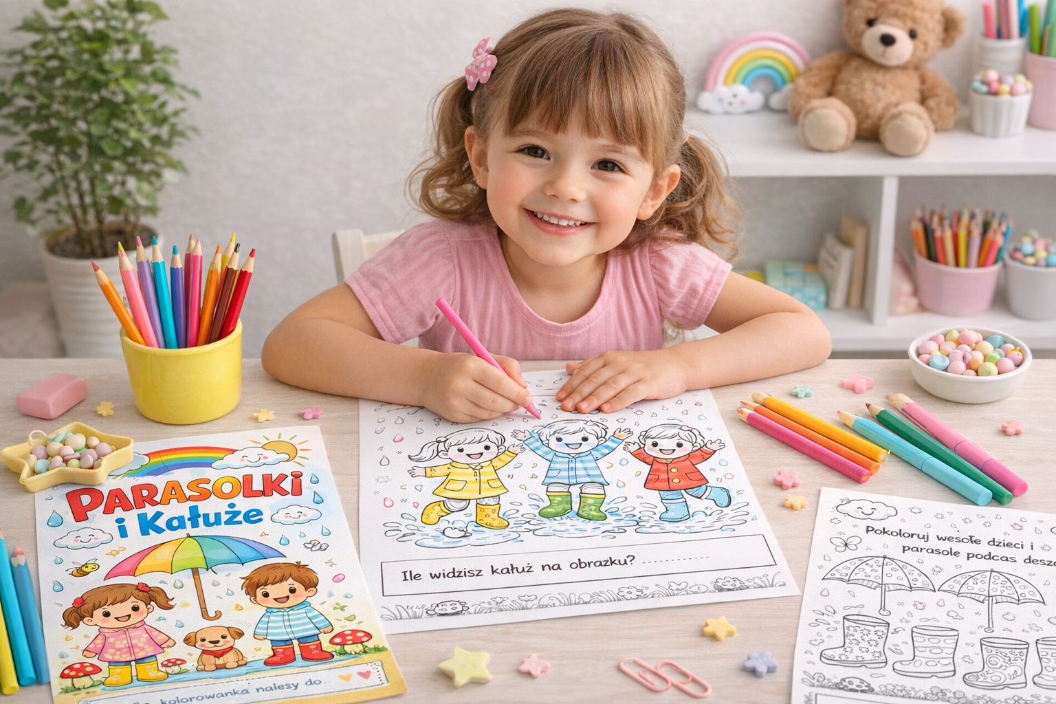 Odkryj świat pełen kolorów, uśmiechniętych twarzy i radości! Przedstawiamy wyjątkową, interaktywną kolorowankę „Parasolki i Kałuże” – idealną dla dzieci w wieku przedszkolnym i wczesnoszkolnym (3–6 lat). 🧒👧
