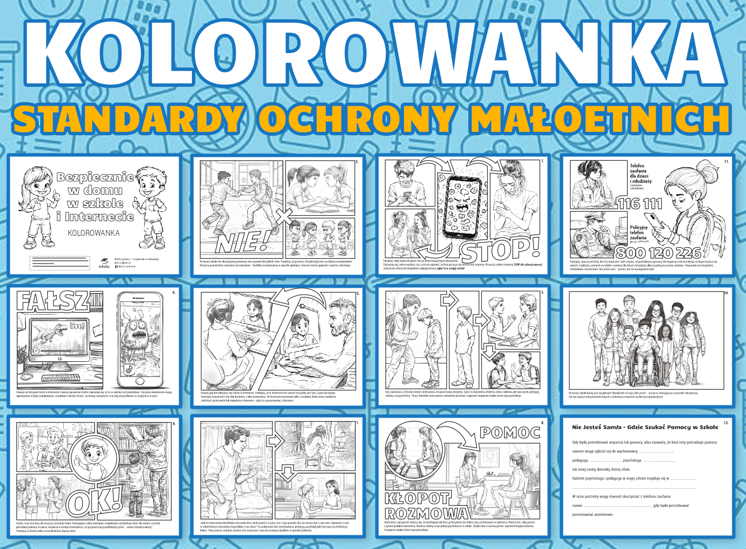 „Kolorowanka edukacyjna "Bezpiecznie w szkole, w domu i Internecie" to starannie opracowane narzędzie, które wspiera dzieci w przyswajaniu kluczowych zasad zbieżnych ze standardami ochrony małoletnich. Zawiera zestaw ilustracji i opisów, które pomagają w zrozumieniu istotnych tematów, takich jak ochrona w szkole, bezpieczeństwo domowe oraz odpowiedzialne korzystanie z Internetu. Dzięki prostym, ale merytorycznym opisom, kolorowanka jest idealna zarówno w pracy indywidualnej z uczniem, jak i w ramach zajęć edukacyjnych w szkołach. Skutecznie angażuje dzieci w rozmowy na temat bezpieczeństwa, jednocześnie rozwijając ich umiejętności manualne i wyobraźnię.