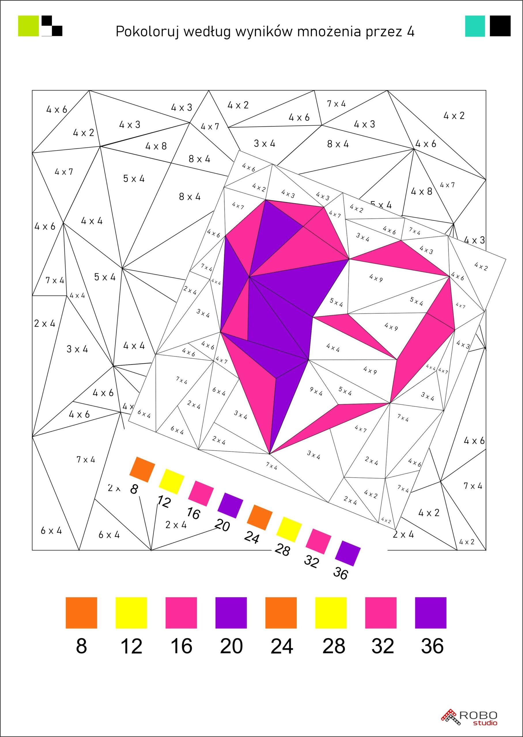 Karta a4 do wydruku, z kolorowanką- mnożenie przez 4. Idealna jako uzupełnienie nauki mnożenia, trening tabliczki mnożenia. Polecamy dla dzieci z klas 2-4 oraz do nauki w domu.