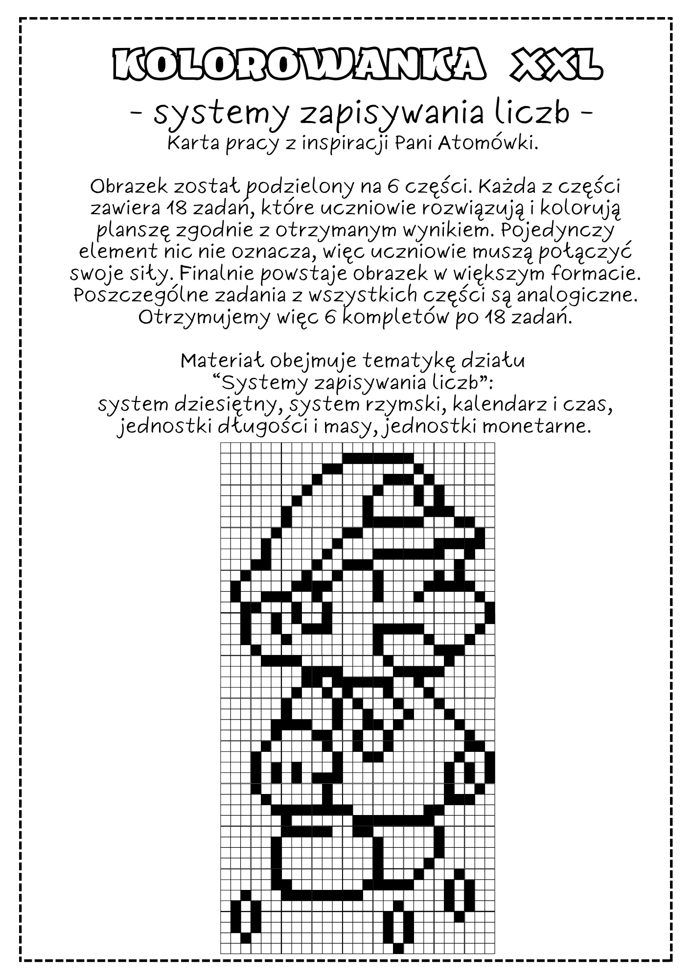 Obrazek został podzielony na 6 części. Każda z części zawiera 18 zadań, które uczniowie rozwiązują i kolorują planszę zgodnie z otrzymanym wynikiem. Pojedynczy element nic nie oznacza, więc uczniowie muszą połączyć swoje siły. Finalnie powstaje obrazek w większym formacie. Poszczególne zadania z wszystkich części są analogiczne. Otrzymujemy więc 6 kompletów po 18 zadań.