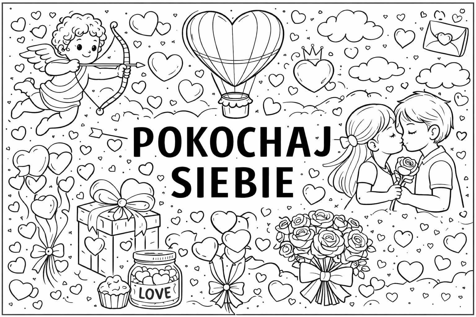 Kolorowanka z okazji Walentynek z napisem przewodnim "Pokochaj siebie".