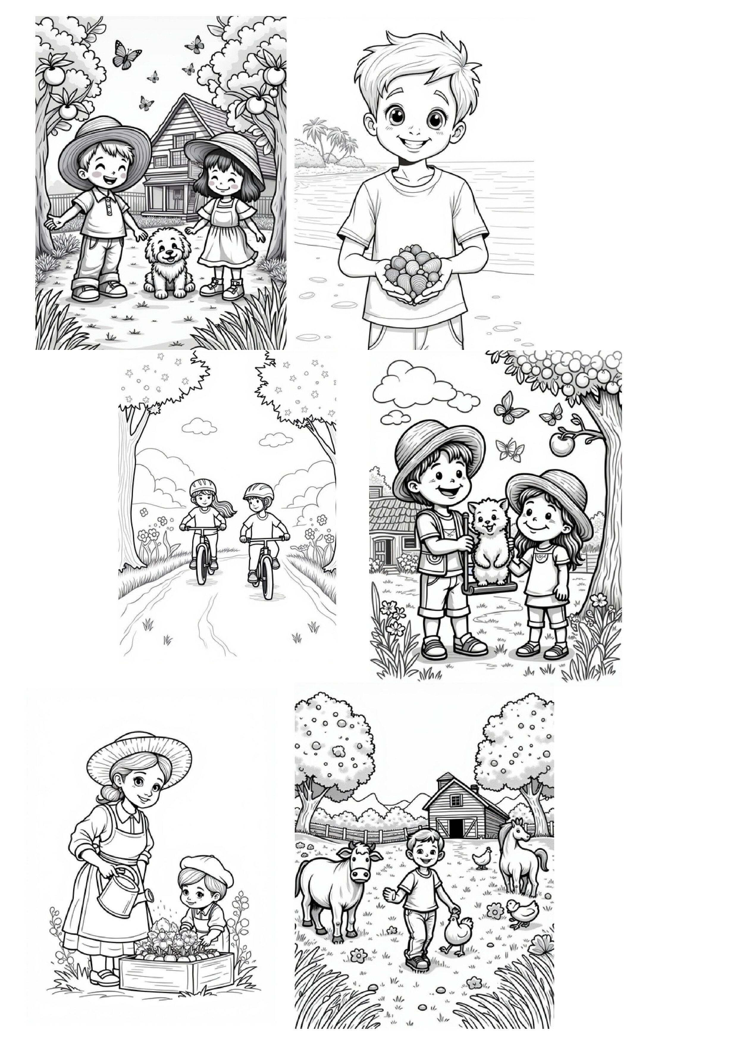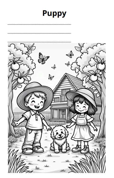 Kolorowanka z uroczymi obrazkami do kolorowania i słowami które przedstawiają wybrany element ilustracji. Możliwość ćwiczenia pisowni słowa w wyznaczonych liniach.