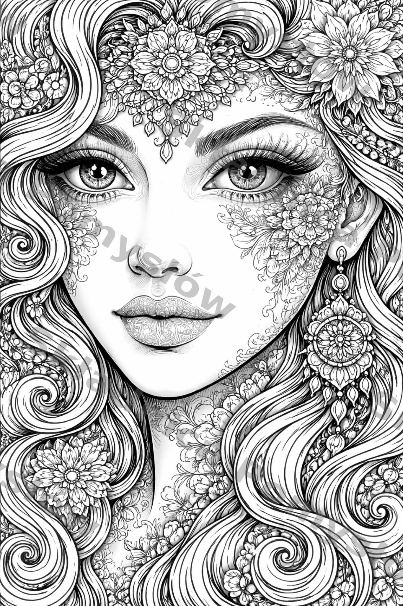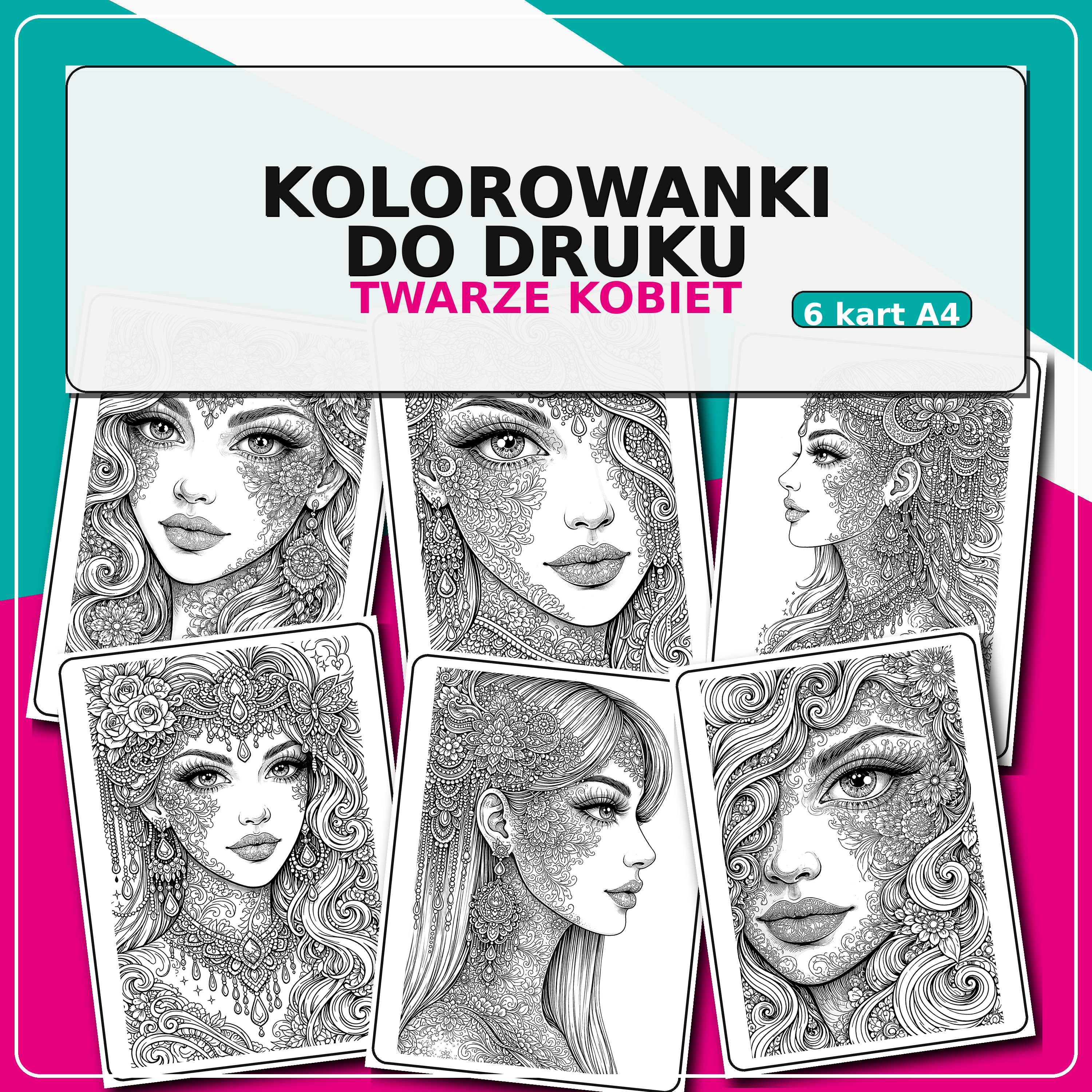 Plik PDF zawiera 6 stron A4 z kolorowankami przedstawiającymi twarze/portrety kobiet w czarno-białej, bogato zdobionej stylistyce (ornamenty, kwiaty, biżuteria, detale boho/mandala; ujęcia en face i z profilu).