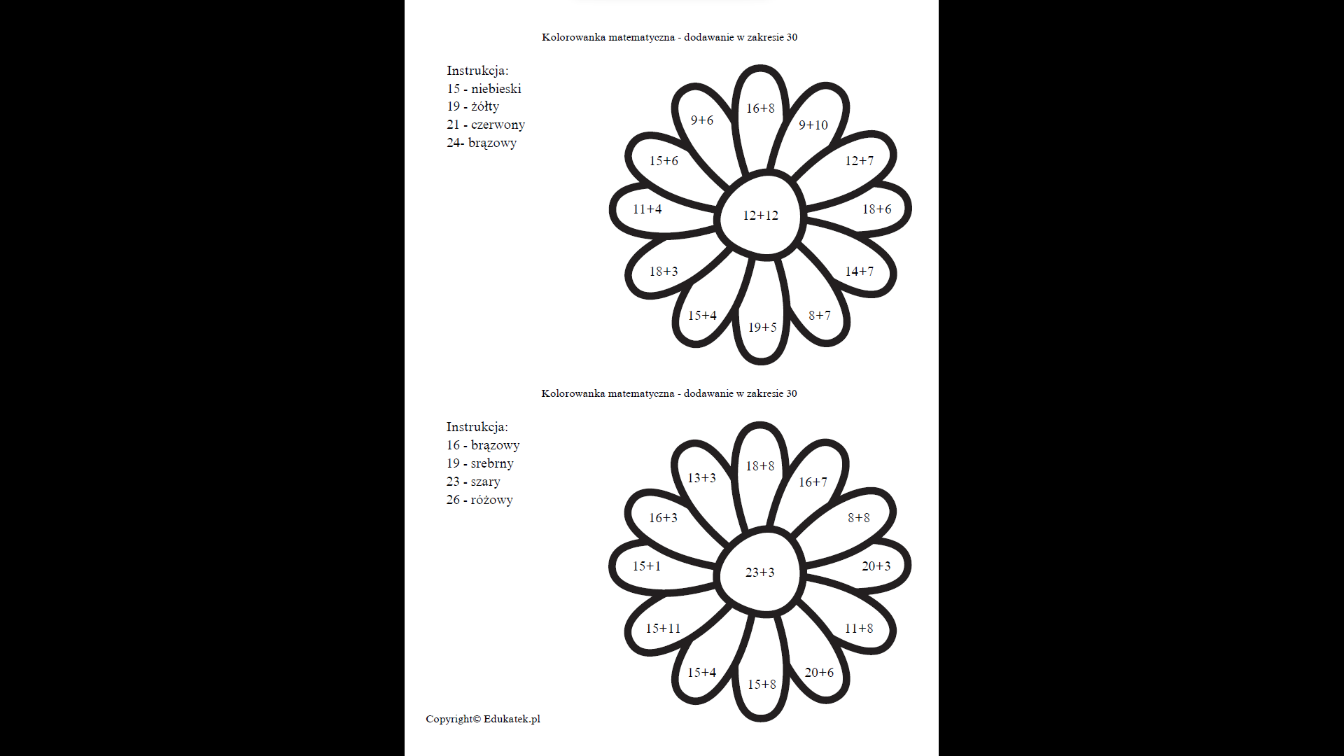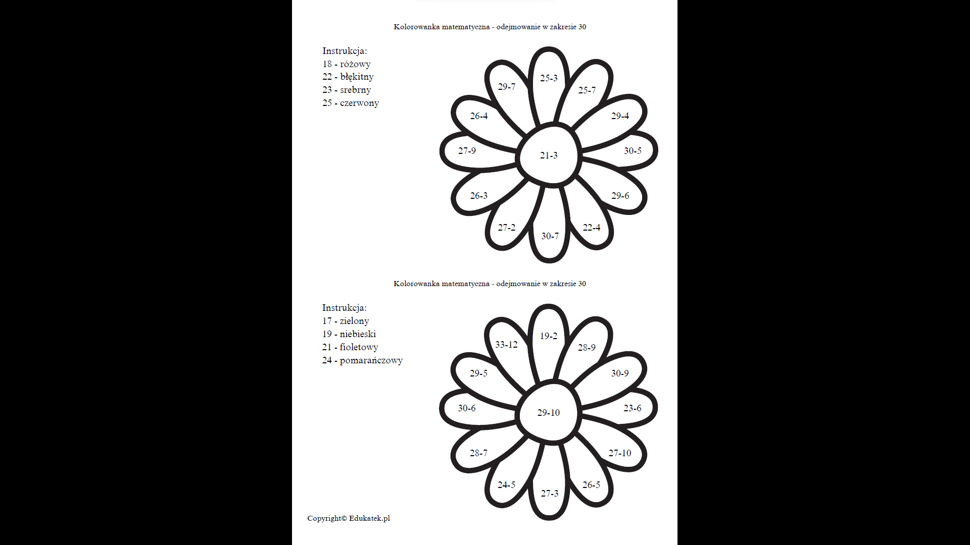 Dziecko oblicza działania i koloruje płatki kwiatka właściwymi kolorami. Karty można wykorzystać między innymi na rewalidacji, zajęciach korekcyjno-kompensacyjnych, rozwijających. Jest także dobrym pomysłem dla uczniów, którzy pracują w szybszym tempie.