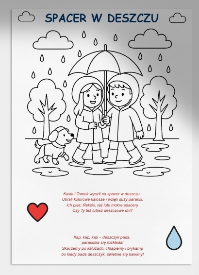 🌦️ Spacer w deszczu – piękna ilustracja wraz z wierszykiem, która zachęca do aktywności i wspólnego spędzania czasu w pochmurne dni.