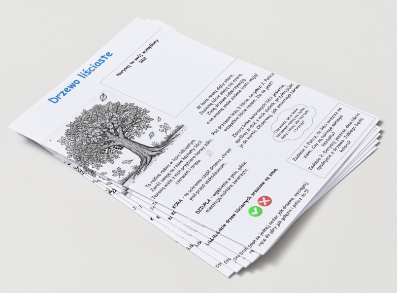 - Drzewo liściaste – rozłożyste gałęzie, spadające liście i cenne informacje o roli drzew w ekosystemie.
