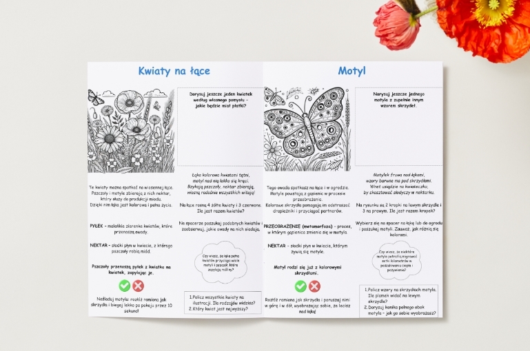 - Kwiaty na łące – soczyste kolory i zapachy wiosny, a także owady zapylające rośliny.