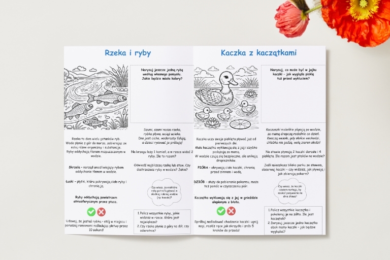 - Kaczka z kaczątkami – nauka o ptasich rodzinach i wykluwaniu się młodych.
