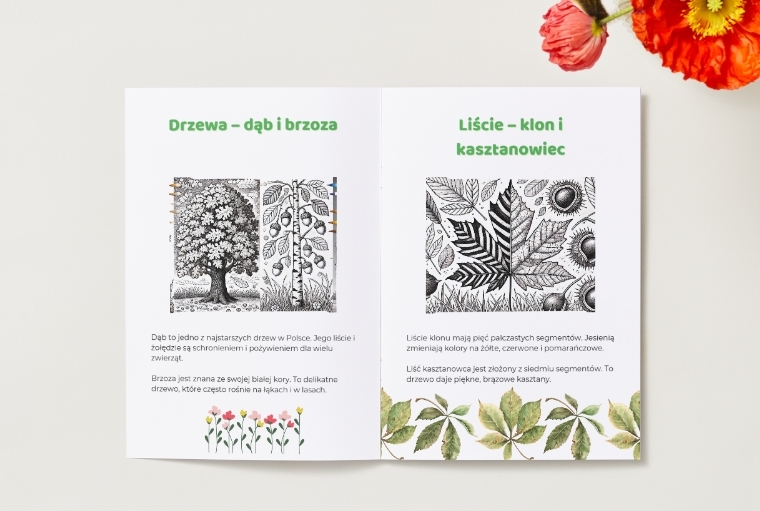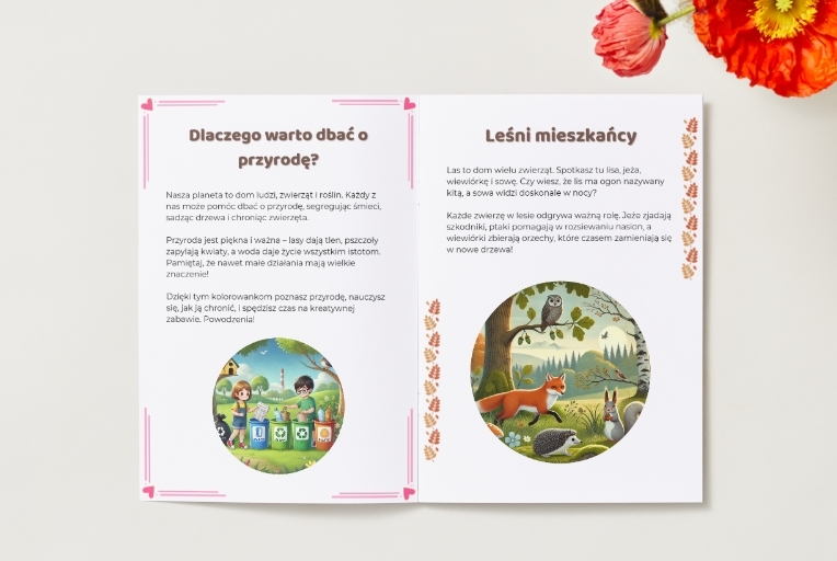 - Inspirujące opisy: Każda strona zawiera krótkie informacje o przyrodzie, np. dlaczego warto oszczędzać wodę, jak ptaki korzystają z budek lęgowych, czy jak działa energia odnawialna.