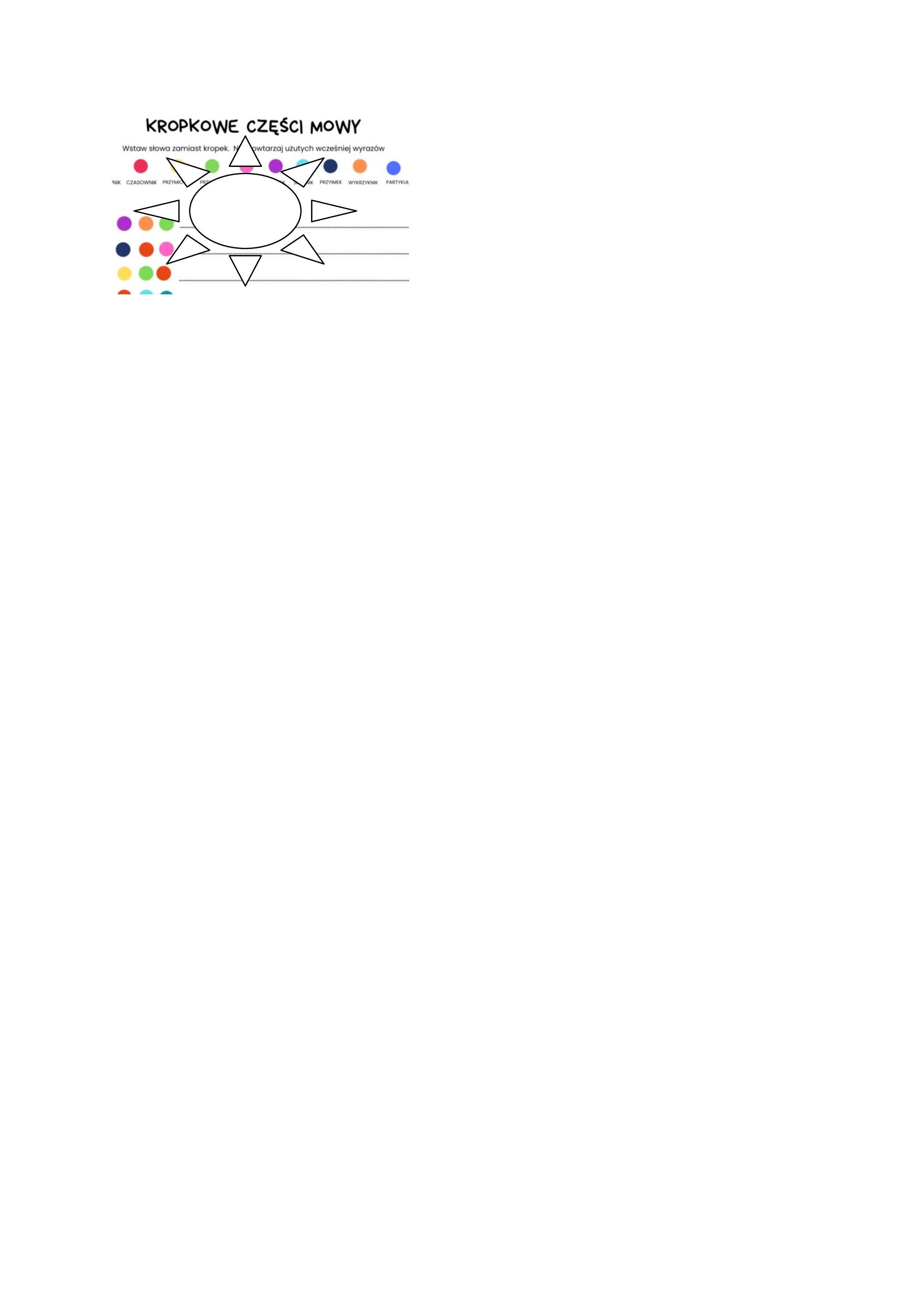 Na karcie znajduje się 10 części mowy (do każdej przypisany odpowiedni kolor) uczeń ma za zadanie zapisać wyrazy odpowiadające danej kolorowej kropce.