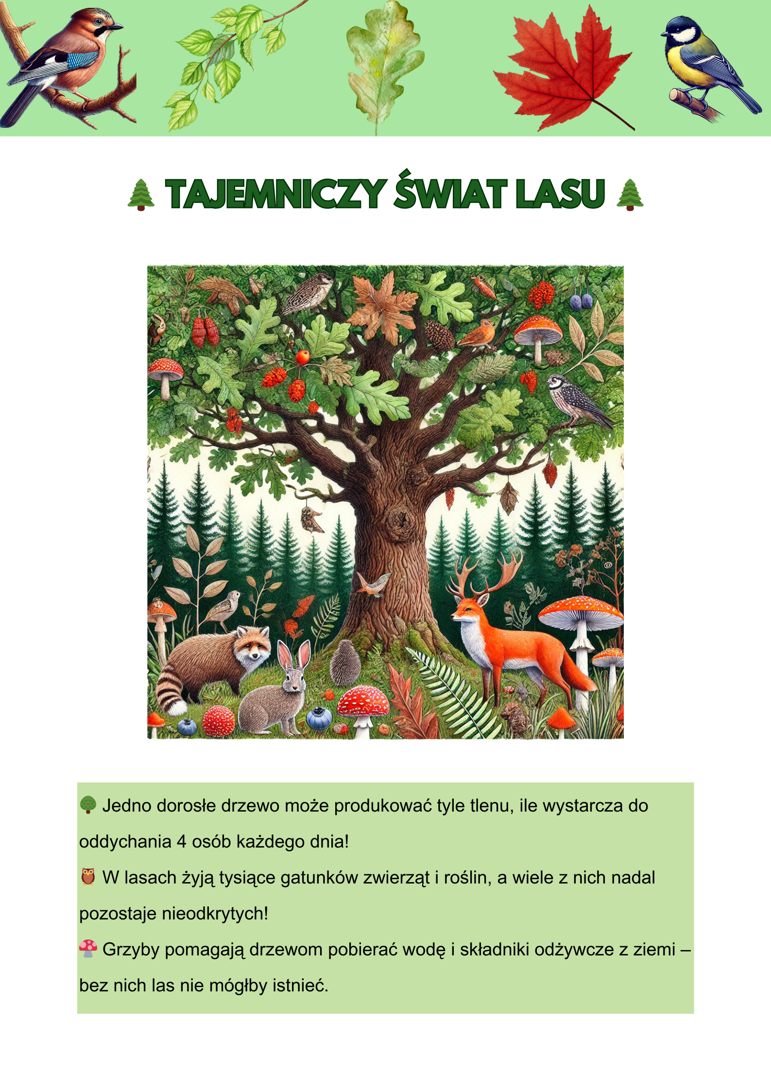 🌳 Tajemniczy świat lasu – Dowiedz się, ile tlenu produkuje jedno drzewo oraz dlaczego grzyby są niezbędne do istnienia lasów. 🦉🍄
