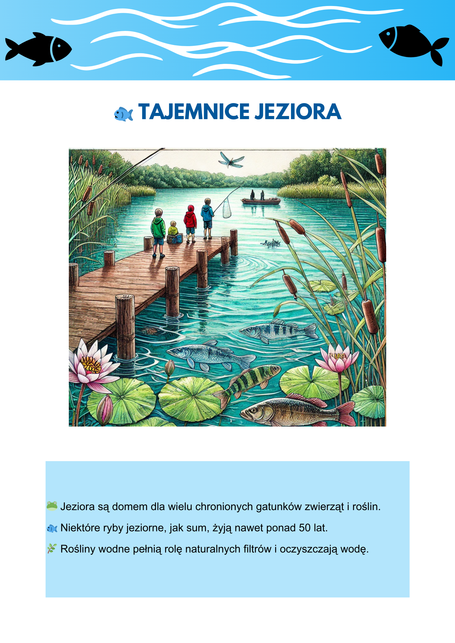 🐟 Tajemnice jeziora – Poznaj zwierzęta, które zamieszkują jeziora oraz jak rośliny wodne naturalnie oczyszczają wodę. 🐸🌿