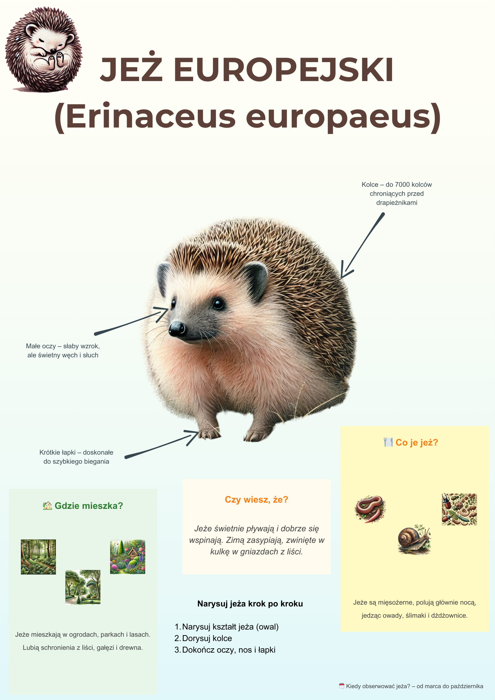 Poznaj jeża, który potrafi się świetnie wspinać i pływać! Dowiedz się, czym się odżywia, gdzie mieszka i jak narysować go samodzielnie.