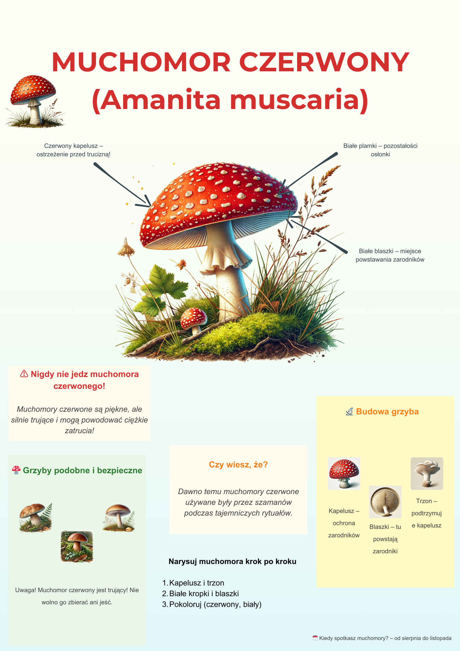 Poznaj najbardziej charakterystycznego grzyba naszych lasów! Naucz się odróżniać go od innych grzybów i narysuj go krok po kroku. Uwaga, jest trujący!