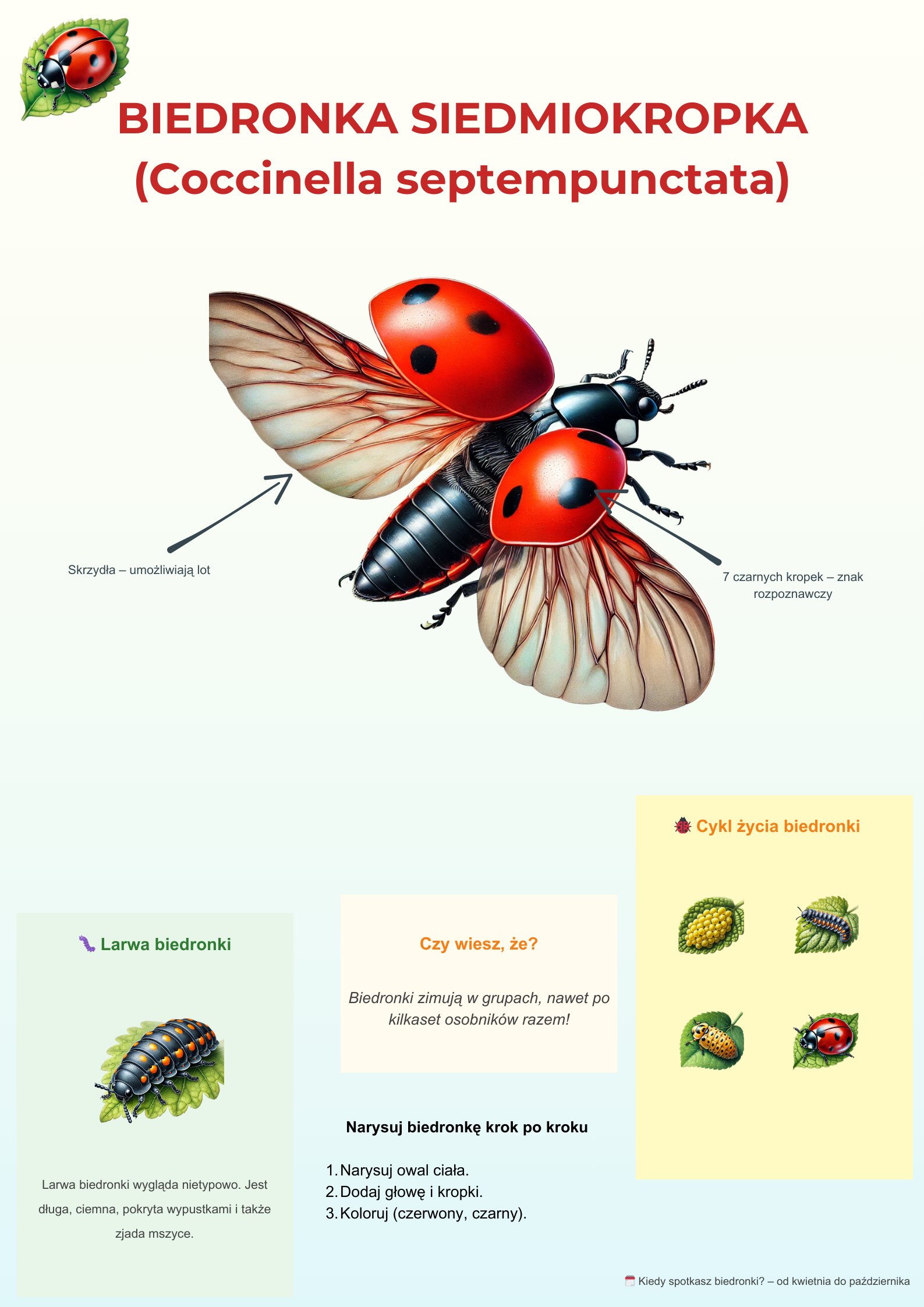 Poznaj cykl życia biedronki, dowiedz się, jak wyglądają jej larwy, i naucz się rysować tę sympatyczną owadzią przyjaciółkę ogrodów.