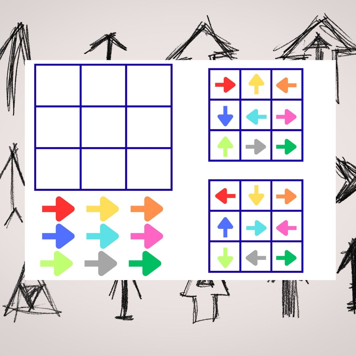 • karty ze wzorami ułożenia strzałek w siatce 3x3