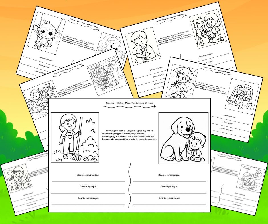 Przedstawiam „Kolorowe Zdania – 60 obrazków do układania zdań” – zestaw dla klas 1–3, który w prosty sposób uczy dzieci tworzyć zdania oznajmujące, pytające i rozkazujące.