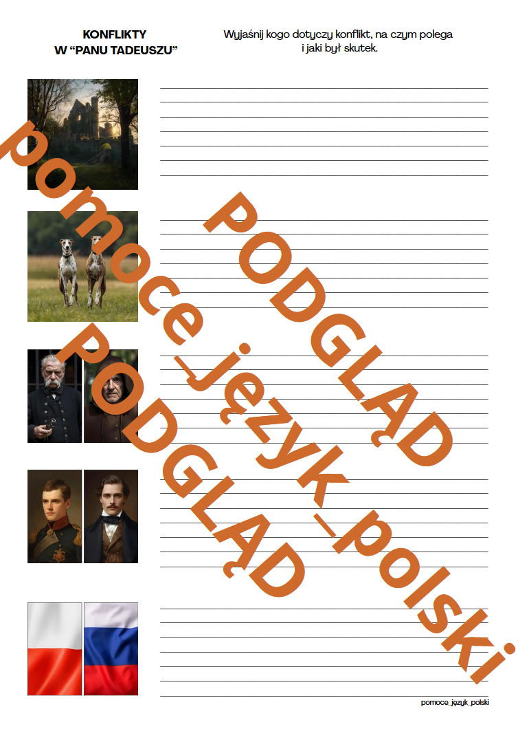 Karta pracy z konfliktami w Panu Tadeuszu może pełnić rolę praktycznego podsumowania lektury. Zawiera zestawienie najważniejszych sporów między bohaterami – rodzinnych, obyczajowych, politycznych i symbolicznych.