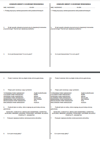 Prosty, konkretny konkurs obejmujący głównie pytania otwarte z zakresu ochrony środowiska m.in. przyczyny i skutki zanieczyszczeń, czy bioróżnorodność objęta ścisłą ochroną gatunkową.