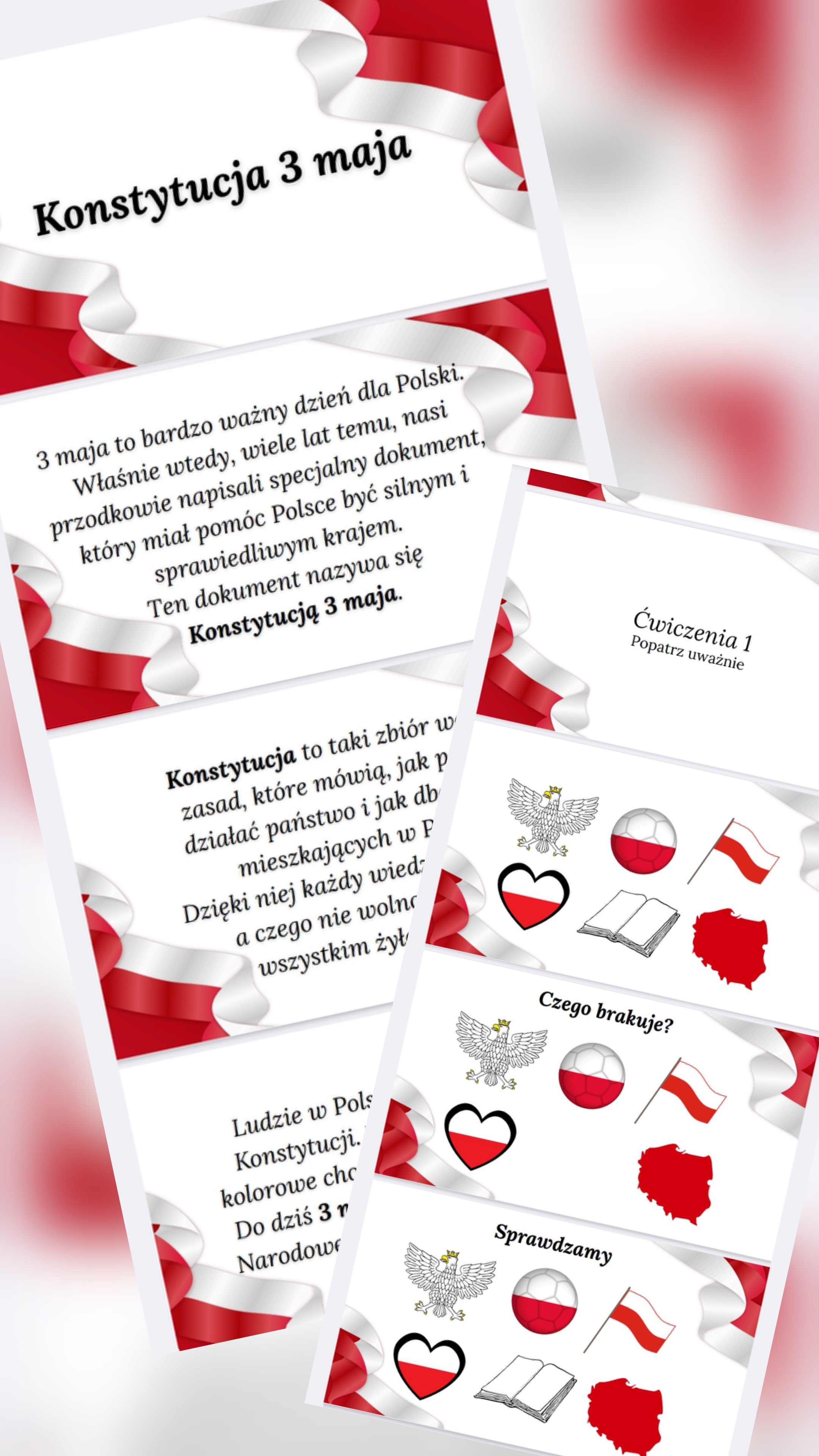 Prezentacja o tematyce Konstytucji 3 maja. Posiada 2 ćwiczenia dla ewaluacji zajęć. Ogólnie 18 stron.