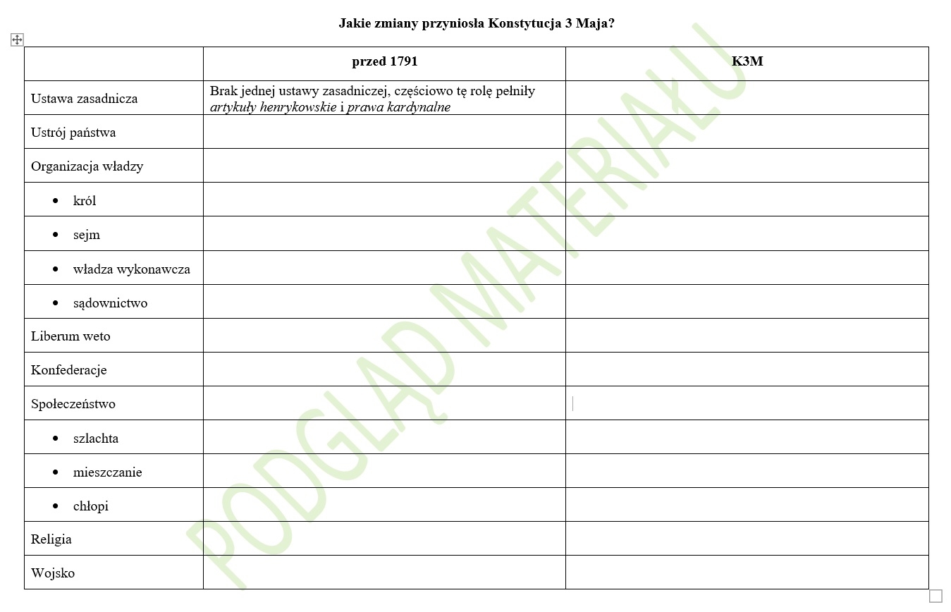 • tabelę z fragmentami  konstytucji i pytaniami pomocniczymi do analizy tekstu oraz małą tabelę służącą do porównania zasad ustrojowych przed i po 1791 roku