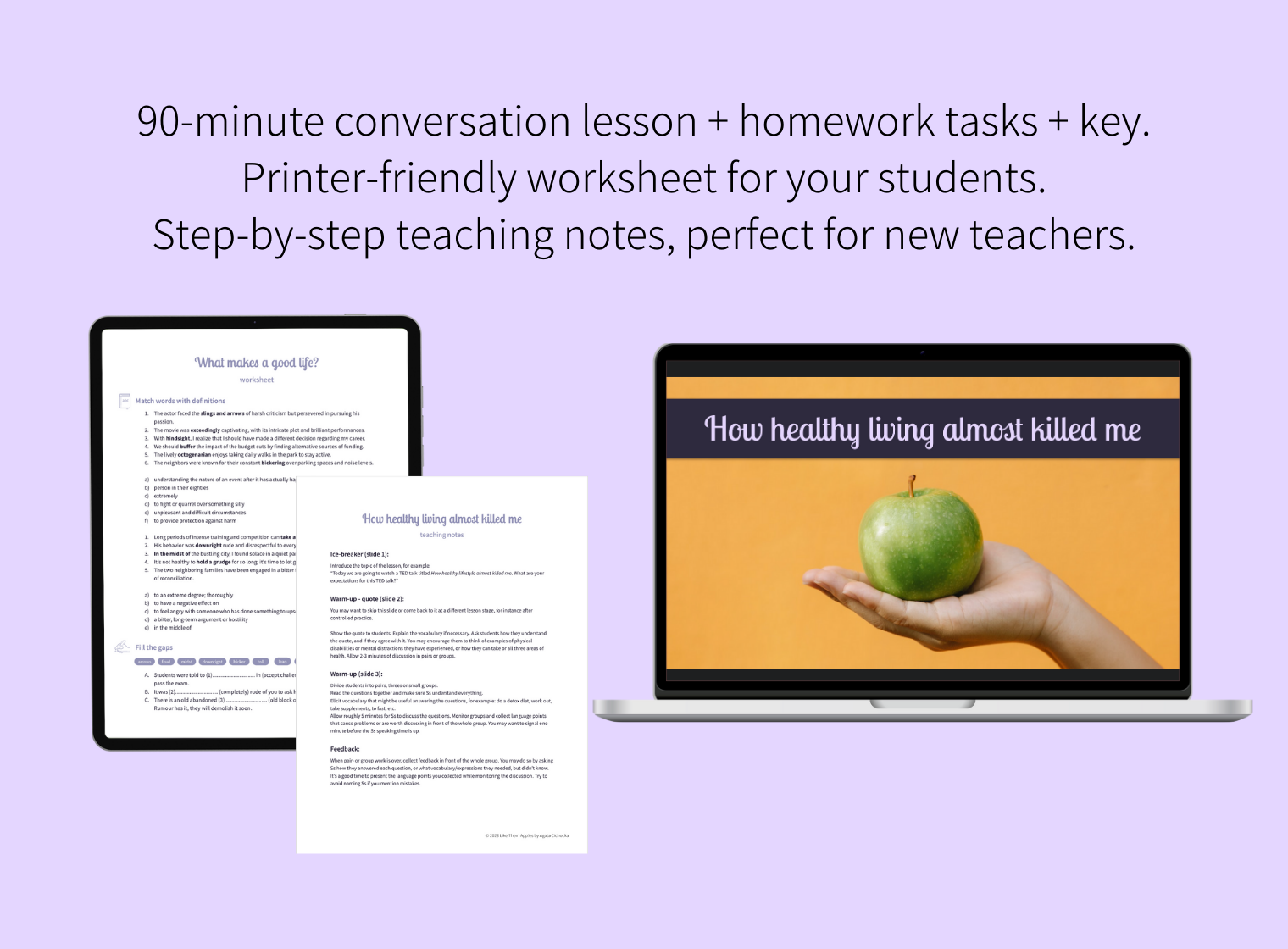 Gotowa lekcja na zajęcia konwersacyjne dla dorosłych uczniów na poziomie B1-B2. Podczas zajęć przygotowanych na podstawie przemówienia TED talk “How healthy living almost killed me” Twoi kursanci nauczą się: