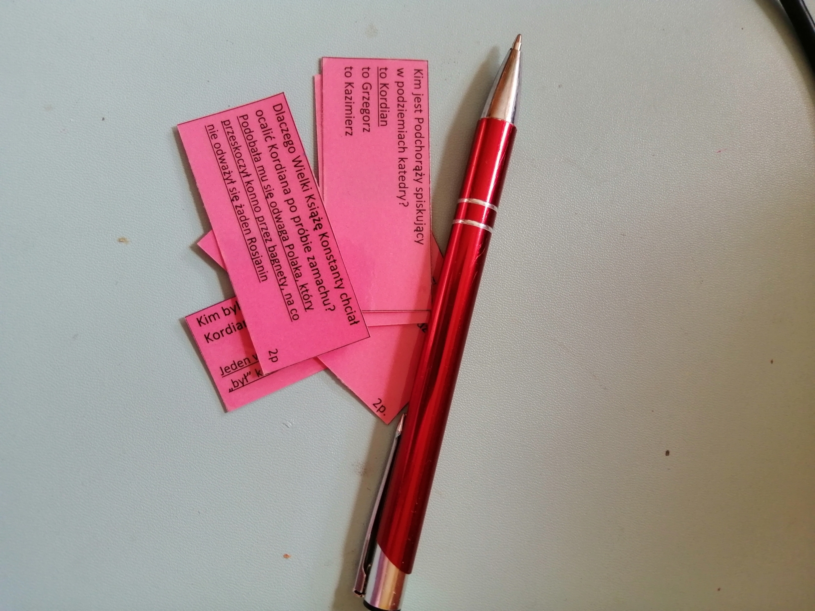 Gra dydaktyczna w postaci niewielkich kart - 3o na stronie A-4 . Każda karta zawiera pytanie i odpowiedź lub ( zwykle) opcje odpowiedzi z wyraźnie zaznaczoną poprawną. Moi uczniowie wzajemnie zadają sobie pytania i świetne się przy tym bawią. Można też grać w klasyczną grę planszową i iść do przodu po udzieleniu poprawnej odpowiedzi ... Możliwości jest wiele.