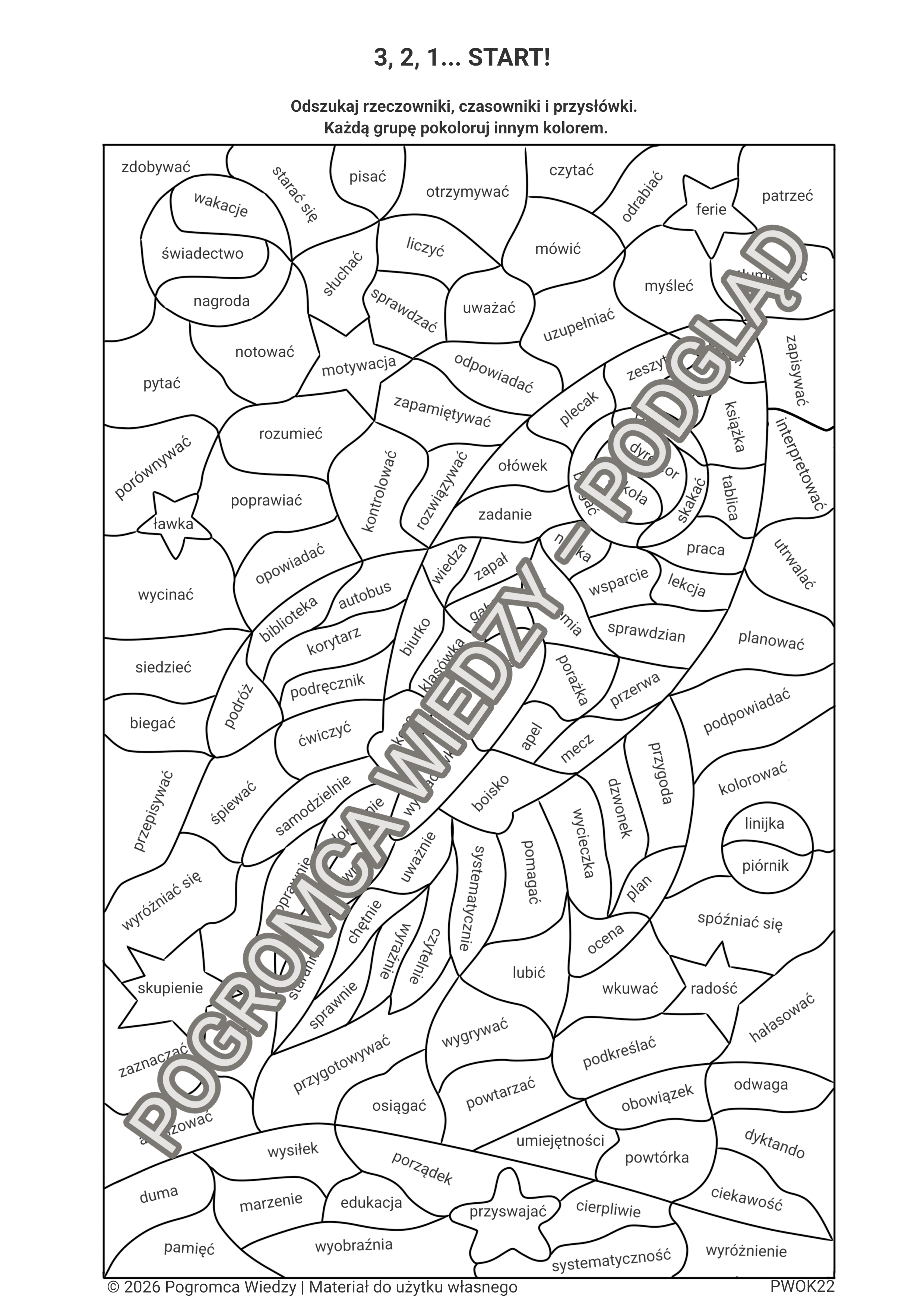 Zestaw zawiera dwie identyczne karty pracy z różnymi poleceniami – dzięki temu można wykorzystać materiał zarówno na początek roku szkolnego („3, 2, 1… START!”), jak i na jego zakończenie („Misja zakończona”). Uczniowie odszukują i rozpoznają części mowy (rzeczowniki, czasowniki, przysłówki), a następnie kolorują je według wskazówek. To atrakcyjna, kosmiczna forma utrwalania wiedzy, która sprawdzi się jako zadanie wprowadzające lub podsumowujące.