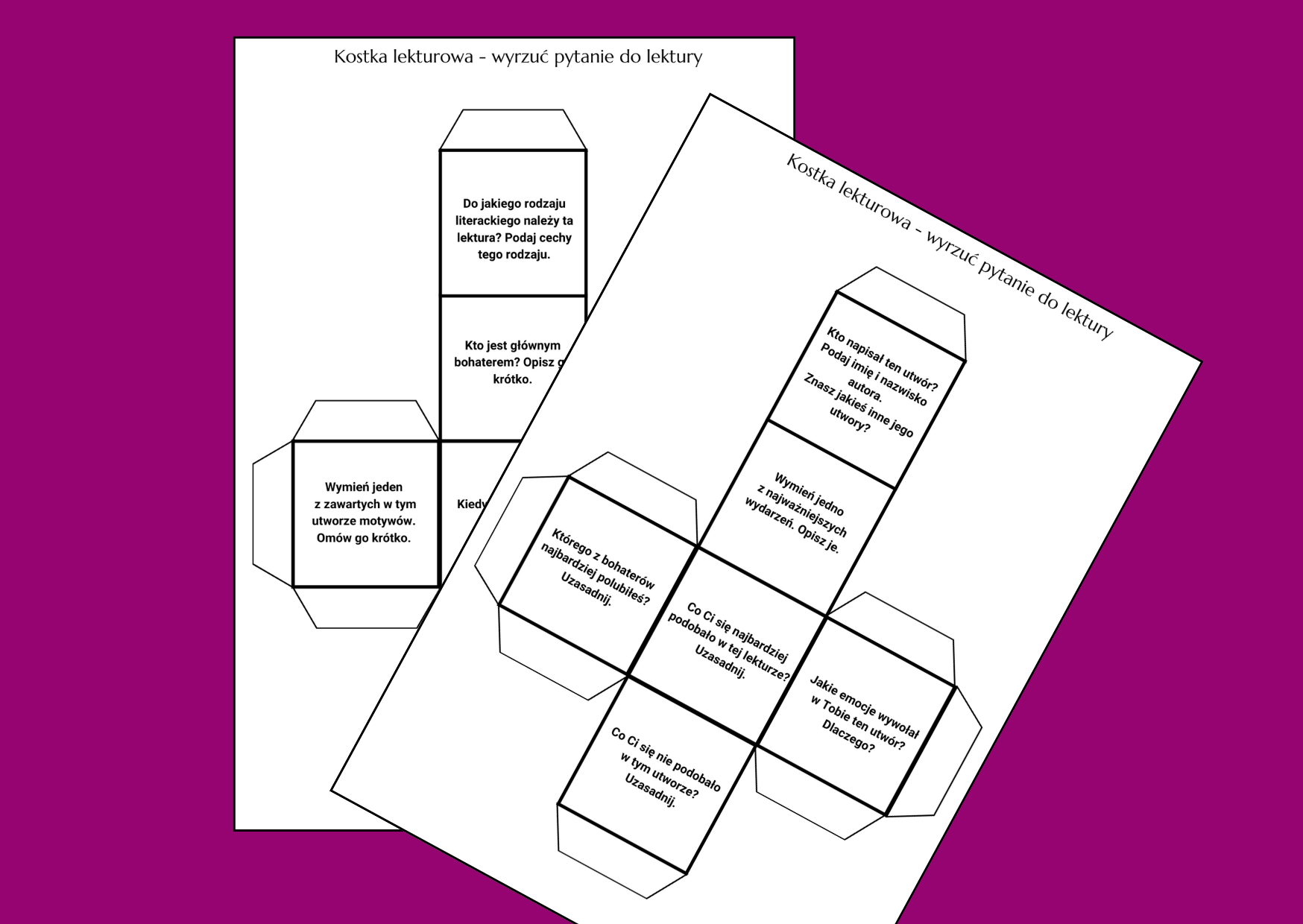 2 kostki do wydrukowania, wycięcia i złożenia. Zawierają uniwersalne pytania do lektur, które można wykorzystać na lekcji pierwszej lub powtórzeniowej.