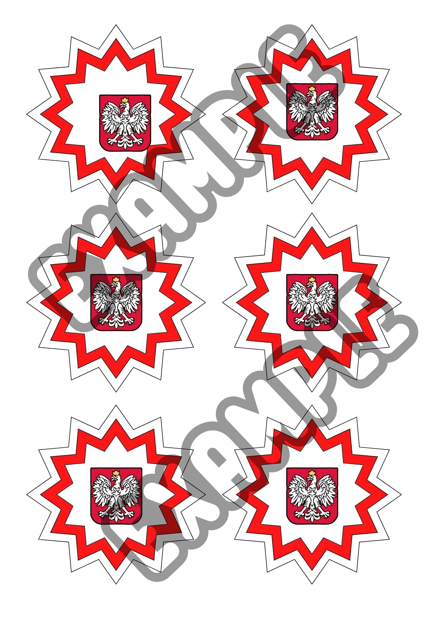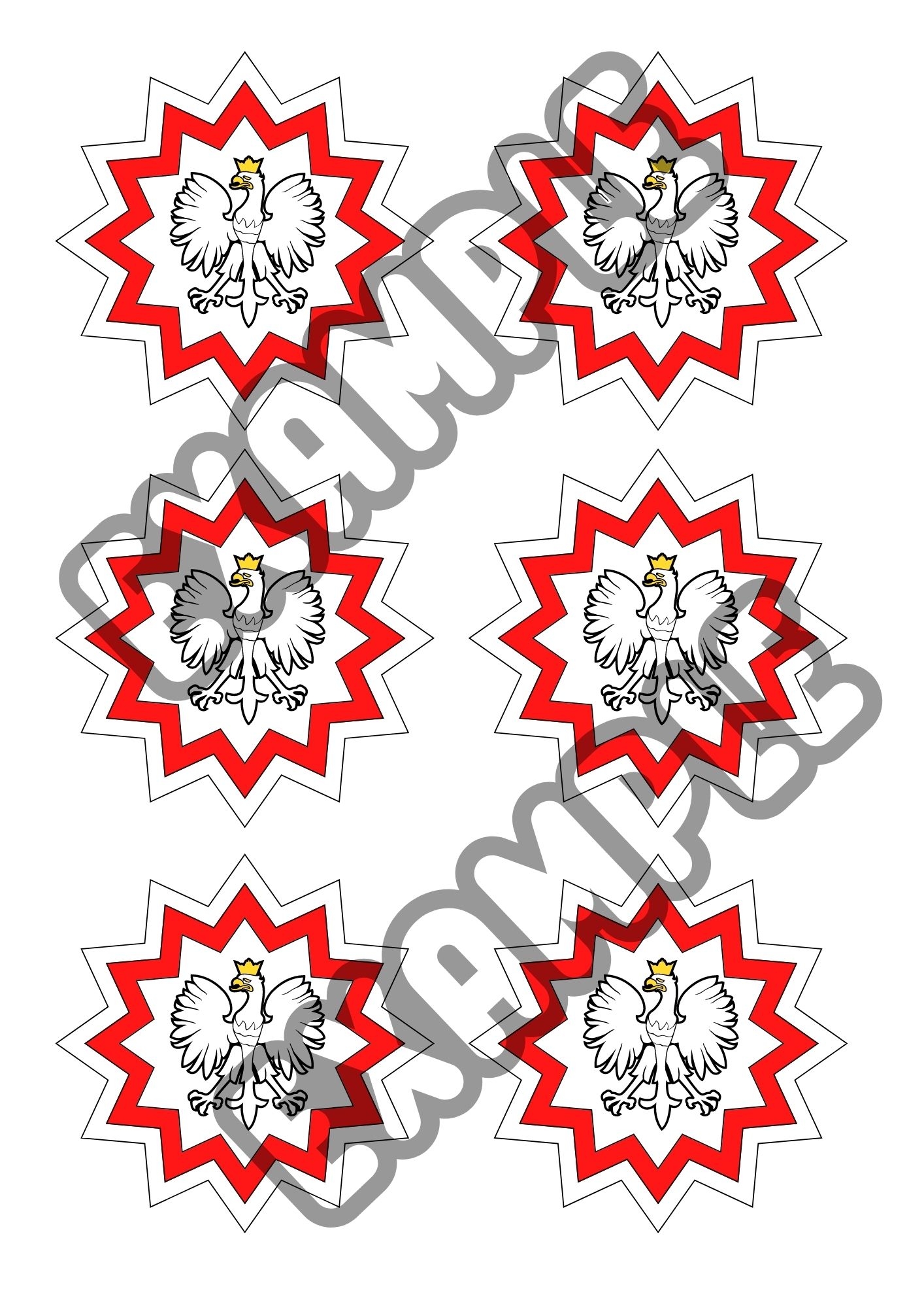 Zestaw kotylionów zawiera 3 karty A4, na każdej stronie znajduje się inny wzór kotylionu. Materiał można samodzielnie wydrukować i wyciąć, a dodatkowo ozdobić biało-czerwoną wstążką lub innymi akcesoriami.  Na każdym arkuszu znajduje się 6 kotylionów.