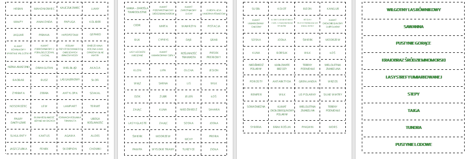 Zapraszam do wykorzystania wycinanki-układanki na lekcję geografii w klasie piątej jako podsumowanie działu o strefach krajobrazowych na kuli ziemskiej. Oferuję 3 strony cech charakteryzujących określoną strefę krajobrazową (rośliny, zwierzęta, klimat). Należy je wyciąć. Zadaniem ucznia jest dopasowanie pojęć do stref. Idealne rozwiązanie na pracę w grupach - można wykorzystać wielokrotnie.